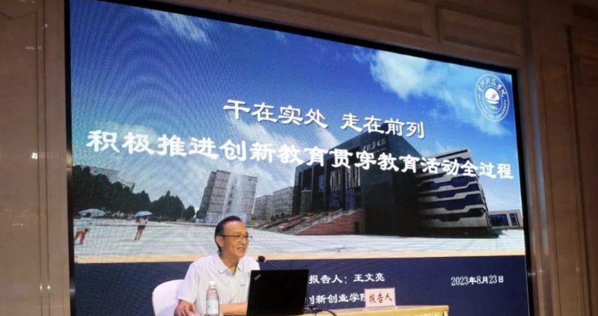 王文亮以《干在实处,走在前列——积极推进创新教育贯穿教育活动全过程》为题,做了精彩的专家报告,介绍了我校在创新创业教育方面的经验与做法。他从领导重视、至真至诚;体系先进、走在前列;机制保障、协同高效;模式创新、干在实处;成果丰硕、奋发勇为;初心如磐,行稳致远六大方面介绍了我校的创新创业型大学建设、专创融合特色课程体系、“以赛促创”实践实训体系、创新创业的工作运行机制、智库资源共享机制、校友资源整合服务机制,教学团队与教学成果。现场氛围热烈,掌声不断,与会的各校领导老师们为我校的优秀做法与成果纷纷点赞。