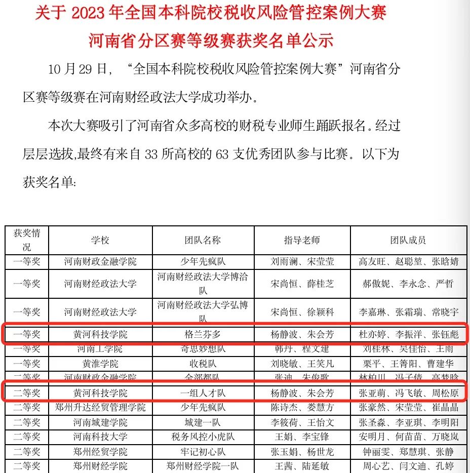 由河南省高等教育学会主办的2023年全国本科院校税收风险管控案例大赛河南省分赛区等级赛于10月29日在河南财经政法大学落下帷幕。我校古天乐太阳集团城两个参赛团队在指导老师杨静波和朱会芳的悉心指导下沉着应战、奋力拼搏分别获一等奖和二等奖的好成绩。