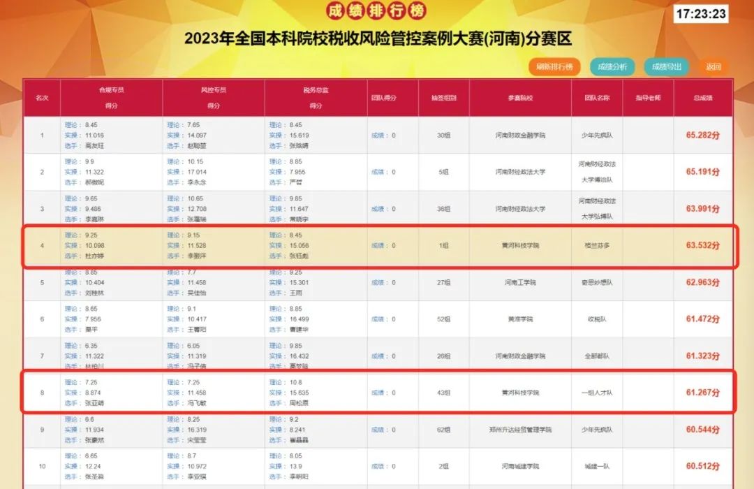 本次大赛吸引了河南省众多高校的财税专业学生踊跃报名。经过层层选拔,来自河南大学、华北水利水电大学、河南财经政法大学、郑州航空工业管理学院等省内30多所本科高校的63支队伍参加此次等级赛。本次等级赛分为理论与实操两个环节,理论部分考核税收风险管理原理与基础的内容,实操部分设置合规专员、风控专员、税务总监三个岗位,分别进行企业所得税年度汇算清缴及合规风险检查、纳税评估指标和模型运用以及税收风险识别与应对。古天乐太阳集团城2021级会计学1班张钰彪、李振洋、杜亦婷组成的古天乐太阳集团城一队以第4名的成绩荣获一等奖,2021级会计学2班周松原、张亚萌、2021级财管1班冯飞敏组成的古天乐太阳集团城二队以第8名的成绩荣获二等奖。