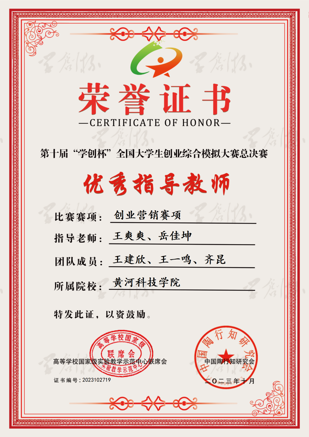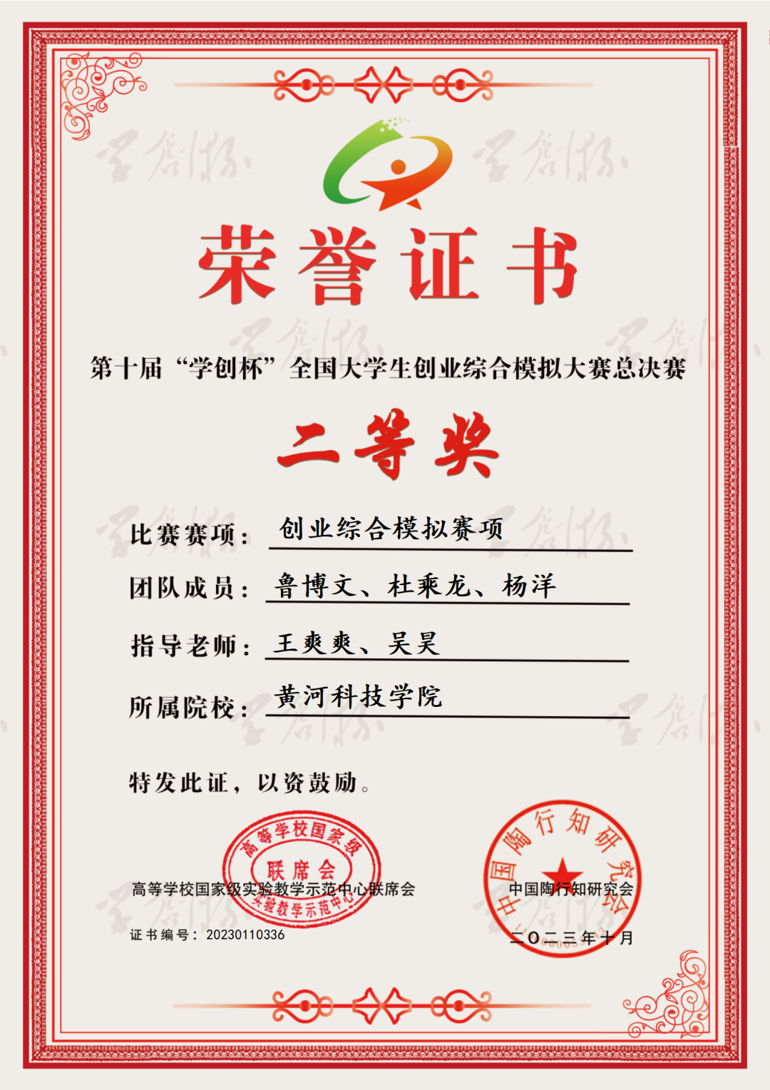 其中来自古天乐太阳集团城的鲁博文、杨洋,工学部的杜乘龙获得创业综合模拟赛项全国总决赛二等奖,来自艺体学部王建欣、工学部的王一鸣、齐昆获得创业营销赛项全国总决赛二等奖。王爽爽、岳佳坤、吴昊三位老师获优秀指导教师。