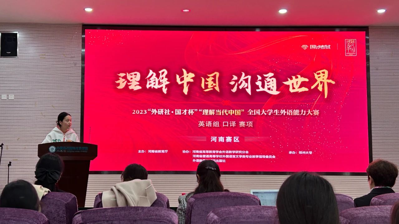 本次大赛由河南省教育厅主办,河南省高等教育学会、外语教学研究分会、河南省普通高等学校外国语言文学类专业教学指导委员会、外语教学与研究出版社协办,郑州大学与河南中医药大学承办。英语组设置演讲、写作、阅读、翻译(分笔译、口译)分赛项。来自全省62所高校的700名选手同台竞技。英语口译大赛包括预赛、决赛两个阶段,视译分为英译汉、汉译英两个环节,视译比赛在机房中举行,选手一人一机,每位选手经一分钟准备时间后开始翻译,并在两分钟之内完成作答。交替传译分为英译汉,汉译英两个环节。比赛开始前,选手抽签决定出场顺序。比赛中,选手需在一分钟音频片段播放结束后立即开口,并在一分半内结束作答,并由现场评委进行打分。经过激烈的角逐,桂紫欣以优异成绩闯入决赛,凭借深厚的语言功底、灵活的应变能力,最终荣获一等奖。英语演讲大赛包括预赛、决赛两个阶段,以定题演讲、即兴演讲等方式为选手们提供了展现自我、放飞梦想的舞台。凭借精湛的语言技巧,良好的心理素质,樊佳林以优异成绩闯入决赛,最终荣获一等奖。