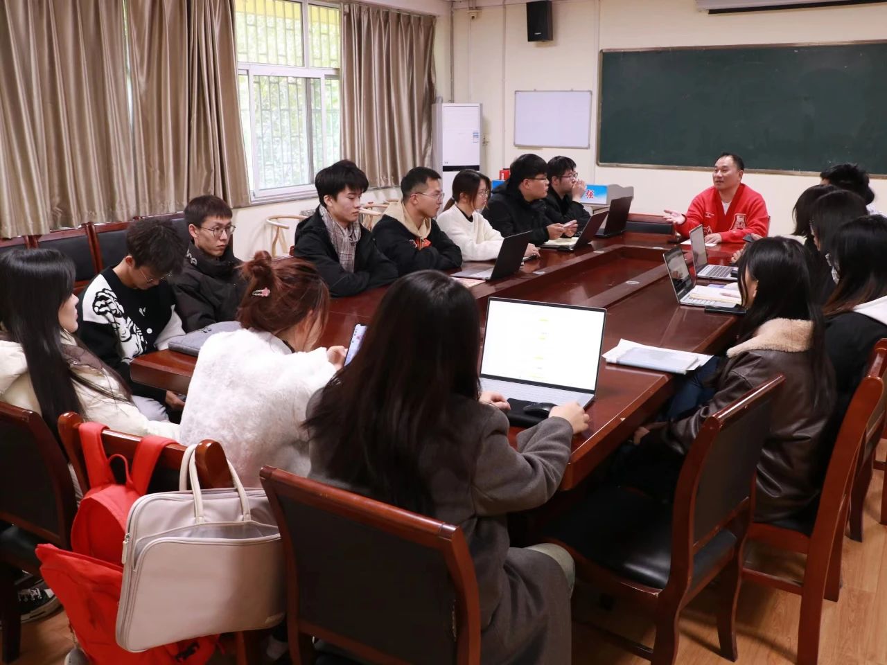 活动伊始,张红玉询问同学们参赛原因及获奖情况,了解参赛同学的基本情况并对同学们的职业规划进行简单评析。随后他对赛事要求,校级赛事、省级赛事及国家赛事的工作指标进行介绍,引导同学们了解自身专业的发展趋势与国家政策相结合,选取合适的职业目标。他着重强调职业规划的步骤,指出要结合自身兴趣、特长和价值观制定职业规划。此外,他还分享了一些求职技巧和面试经验,为同学们提供实用性的职业规划意见。接着活动随着进入到你问我答环节达到高潮。同学们积极提出自己的问题,张红玉耐心地从升学、创业等多角度提出自己的见解,告诉大家在坚持的道路中遇到困难时解决困难并寻求创新。最后张红玉介绍赛事时间节点,强调大赛重要性和总结活动内容。