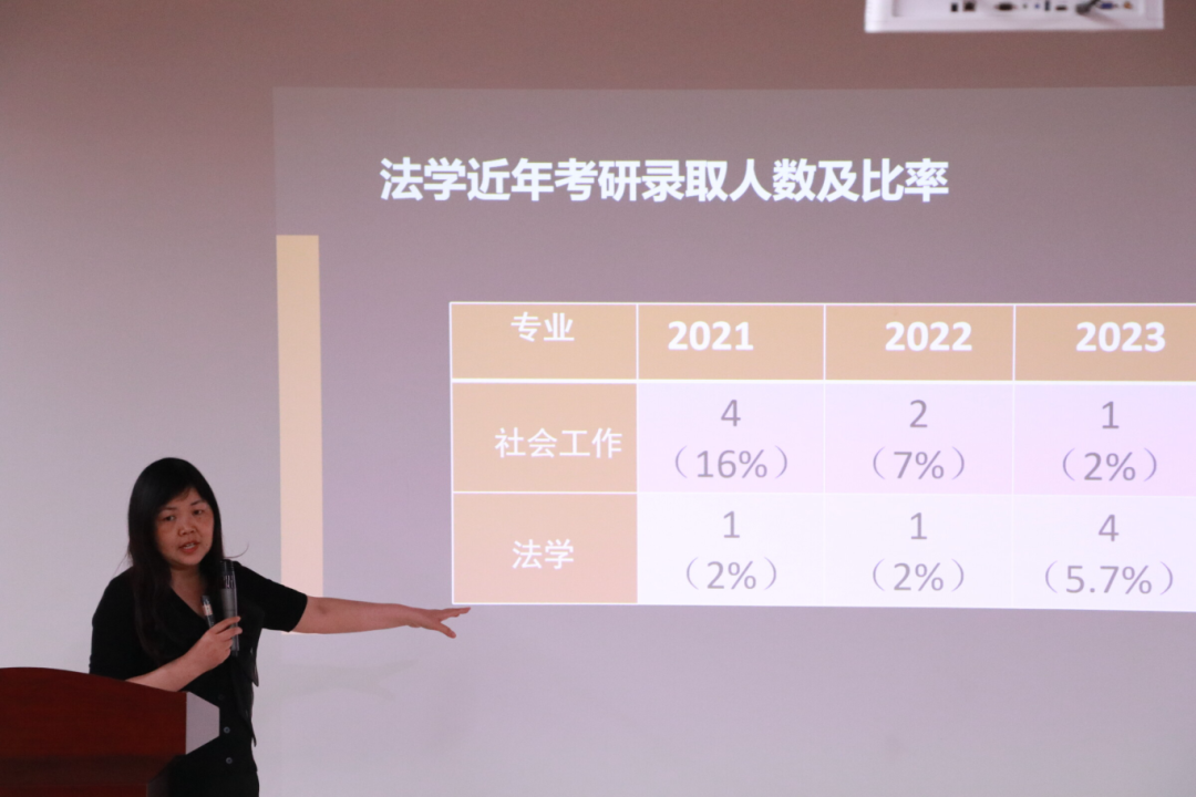法学科教中心主任何祖普主任交流升学工作。2024届法学专业升学率13.2%,社会工作专业升学率15.3%,法学中心能够统一认识,同心同力同向,严格落实学部各项要求,密切师生联系。何祖普指出,对待考研工作要常存敬畏之心、尊重客观规律,同时保持理性与热爱。党政学工办主任张伟锋作大会交流。张伟锋指出新形势下学部考研工作面临新挑战,也存在不足。要树立“123”考研就业工作思路,全员参与考研就业组织模式。通过全学程规划、个性化精准服务、细化考核等措施构建“全程化—全员化—个性化”升学服务体系。