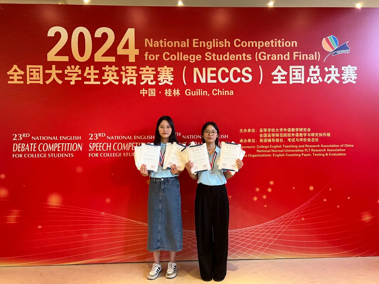 在我校教育教学中心以及各单位领导的高度重视和关心下,在老师的悉心指导下,樊佳林和周梦媛积极参与各项赛事,认真准备各个竞赛活动,以流利的英语发音、扎实的语言基本功、睿智的应变能力赢得了评委和参赛选手的认可,获得了一系列奖项。樊佳林说:“大英赛全国总决赛的舞台上的精彩之处在于汇集了天南地北的优秀选手,从他们身上我学到了很多,我相信推动着我向前的正是遇到的优秀的人们、倾注汗水和热爱的经历以及一次次重整旗鼓的勇敢和坚定。”周梦媛说:“很荣幸能够参加这次比赛,这是我人生中一次宝贵的经历。我要感恩我的团队伙伴们,是大家的团结协作和相互支持,才走到了今天。这次参赛,让我看到了自身的不足,也明确了努力的方向,会继续努力,不断提升自己。”