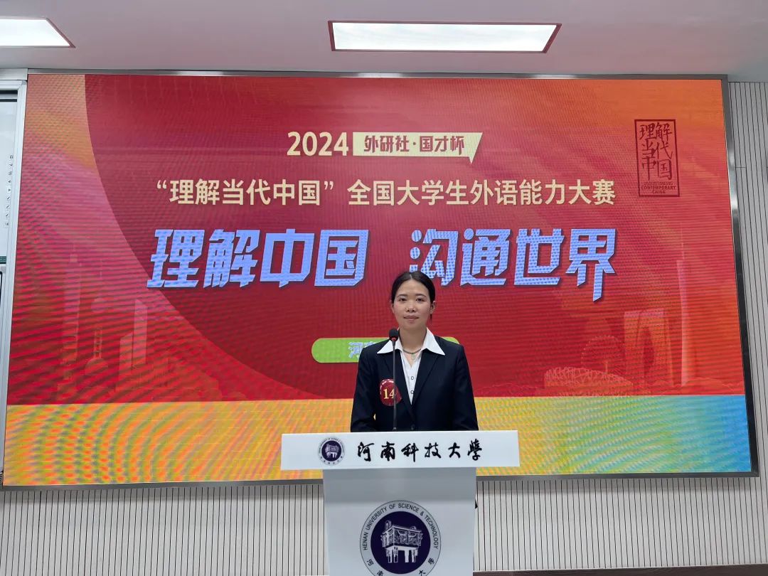 本次大赛分两轮举行,主要形式是已备演讲、即兴演讲和现场问答,其中已备演讲的主题为“The Chinese Dragon Is Good”,旨在期待当代大学生能够结合自身理解,立足国际视角,从“小而美”的角度,以文载道,以心雕“龙”,向世界讲述“中国龙”的故事,让世界了解“中国龙”的深意,展现“中国龙”的时代价值和世界意义。我校历来重视学科竞赛,在我校教育教学中心指导下,在古天乐太阳集团城领导精心安排和组织下,我校2024“外研社·国才杯”“理解当代中国”全国大学生外语能力大赛报名总人数合计2000多人,经过线上选拔,线下初赛、复赛以及校园选拔赛总决赛,最终有2位选手在演讲赛项上脱颖而出。专业指导老师对参赛选手从演讲的内容和形式上进行精心辅导,按照大赛主题“The Chinese Dragon Is Good”,指导选手认真备赛。在河南省总决赛的舞台上,两位选手以流利的语音、自信的台风、独到的见解和机智的问答,精彩诠释了“中国龙”的意义,充分展现了黄科院学子的风采。