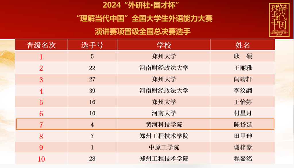 11月9日-10日,2024“外研社·国才杯”“理解当代中国”全国大学生外语能力大赛演讲赛项河南省决赛在洛阳河南科技大学圆满落幕。我校选手2022级播音与主持艺术专业陈岱延和2022级商务英语专业张婷代表我校参加比赛,与来自全省各高校134名优秀选手激烈对决,最终,张婷获得省赛三等奖,陈岱延获得省赛特等奖,并以河南赛区前十强唯一一位来自民办高校的选手晋级全国总决赛,也是我校学子在此项赛事中第一次进入全国总决赛,实现了零的突破。
