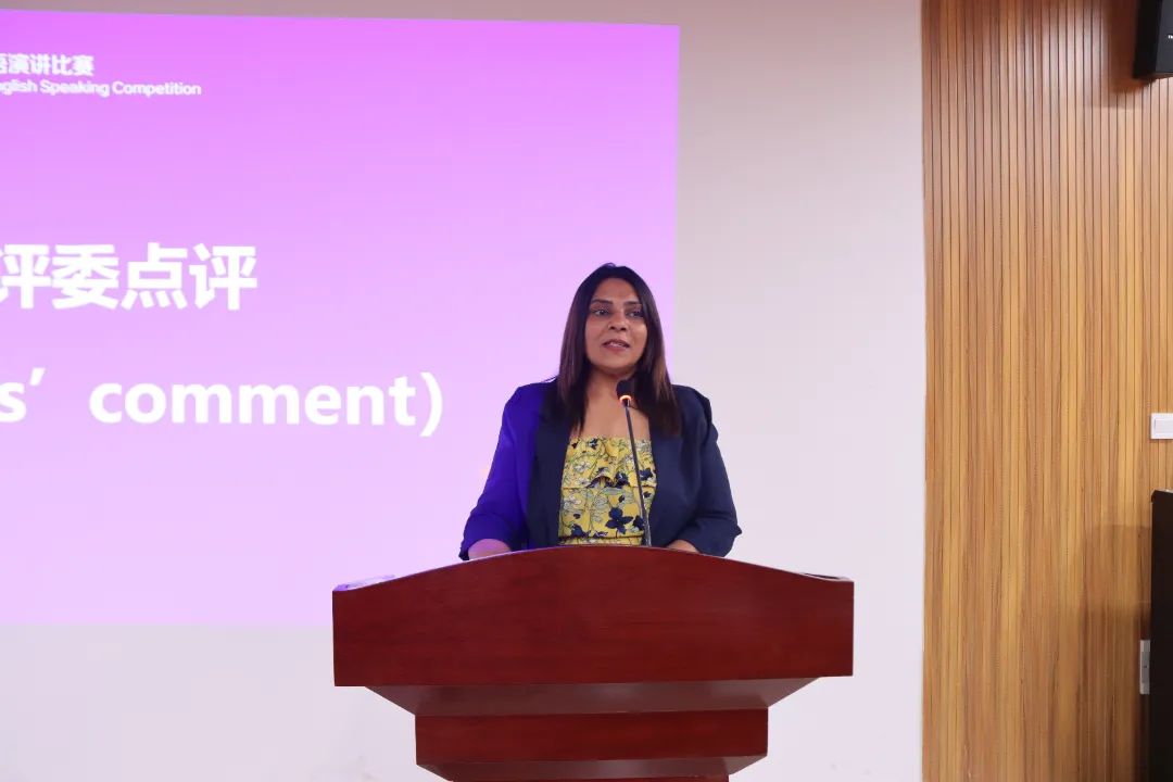 外籍教师Bina Rai Thoolsee Naidoo做了精彩点评,她首先对选手的表现做了肯定,她认为参赛者表现都很棒,每个人都很出色,且各有独特之处,不仅展示了语言基本功,也展示了自己的演讲技巧。她也在口语表达、词汇储备、英语发音等各方面个了详细的指导意见。同时,她希望看到同学们能够不断奋进,克服挑战,取得成功。