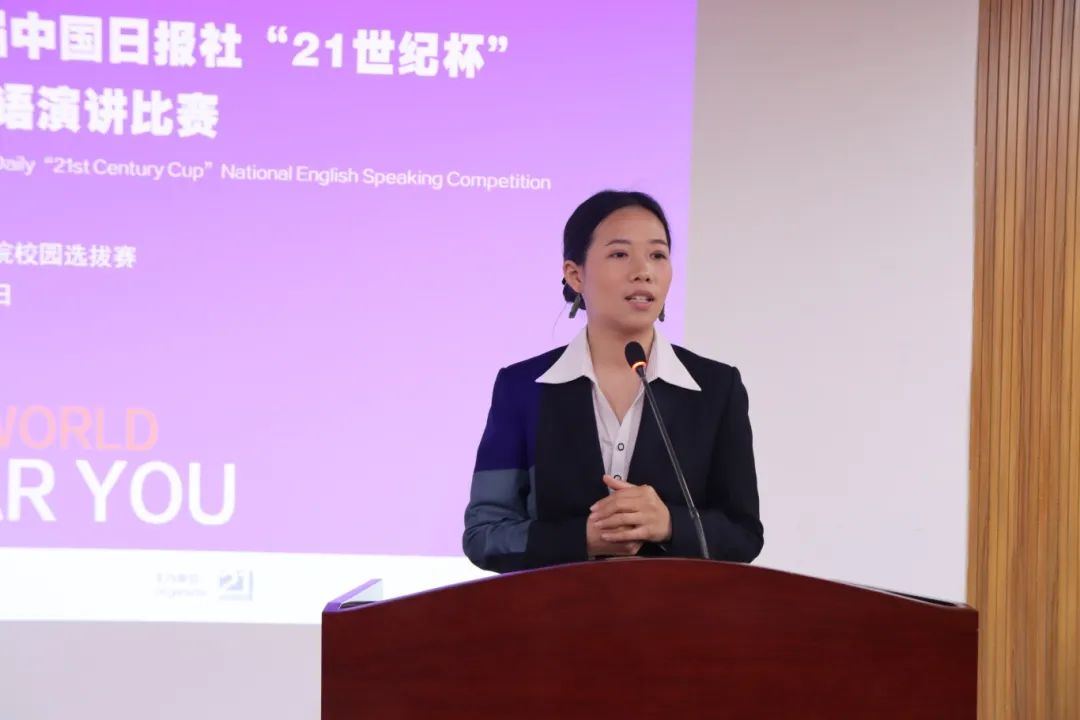艺体学部2024级播音与主持艺术专业高熙婧感言:“很幸运能够进入21世纪杯校园选拔赛决赛,备赛期间,着重注意演讲稿每个单词的发音、眼神交流以及体态语言。用录视频的方式去观察我的每个细节处理。通过这次比赛,我深刻感受到了大学带给我带来的变化。我喜欢英语,所以我会努力争取每一次展示的机会,也希望喜欢英语的同学们可以大胆做自己,展示自己!”