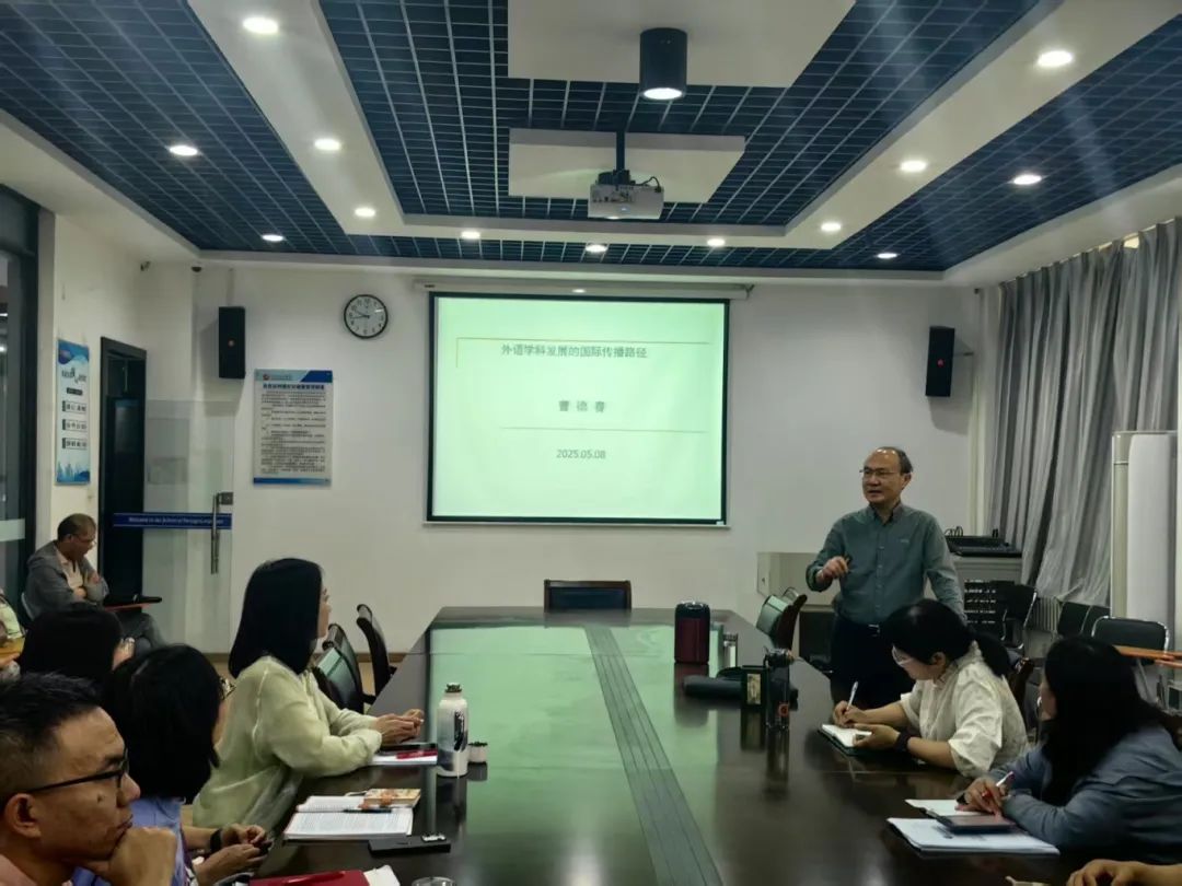 5月8日下午,曹德春教授在古天乐太阳集团城北楼109教室为外语科教中心教师做了一场题为“外语学科发展的国际传播路径”的学术讲座。讲座由外语科教中心副主任贾和平主持。