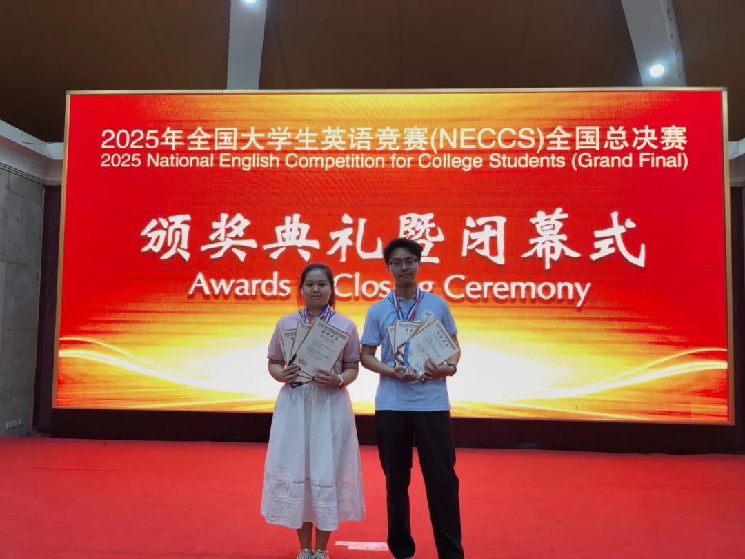 赵谷雨和陈岱延两位选手从初赛开始,一路过关斩将,最终代表我校参加了2025年全国大学生英语竞赛(NECCS)全国总决赛,与来自全国30个省市、200多所高校的323名选手同台竞技。本届总决赛由一系列丰富多彩的赛事和活动组成,包括英语演讲比赛、英语辩论赛、英语风采大赛和英语学习经验交流会、英语角等。所有活动均在全封闭的英语环境中进行并安排中外英语教育专家全程参与,营造了一个全英的语言文化氛围,在寓教于乐中训练学生的英语听说能力,提高英语交际能力。