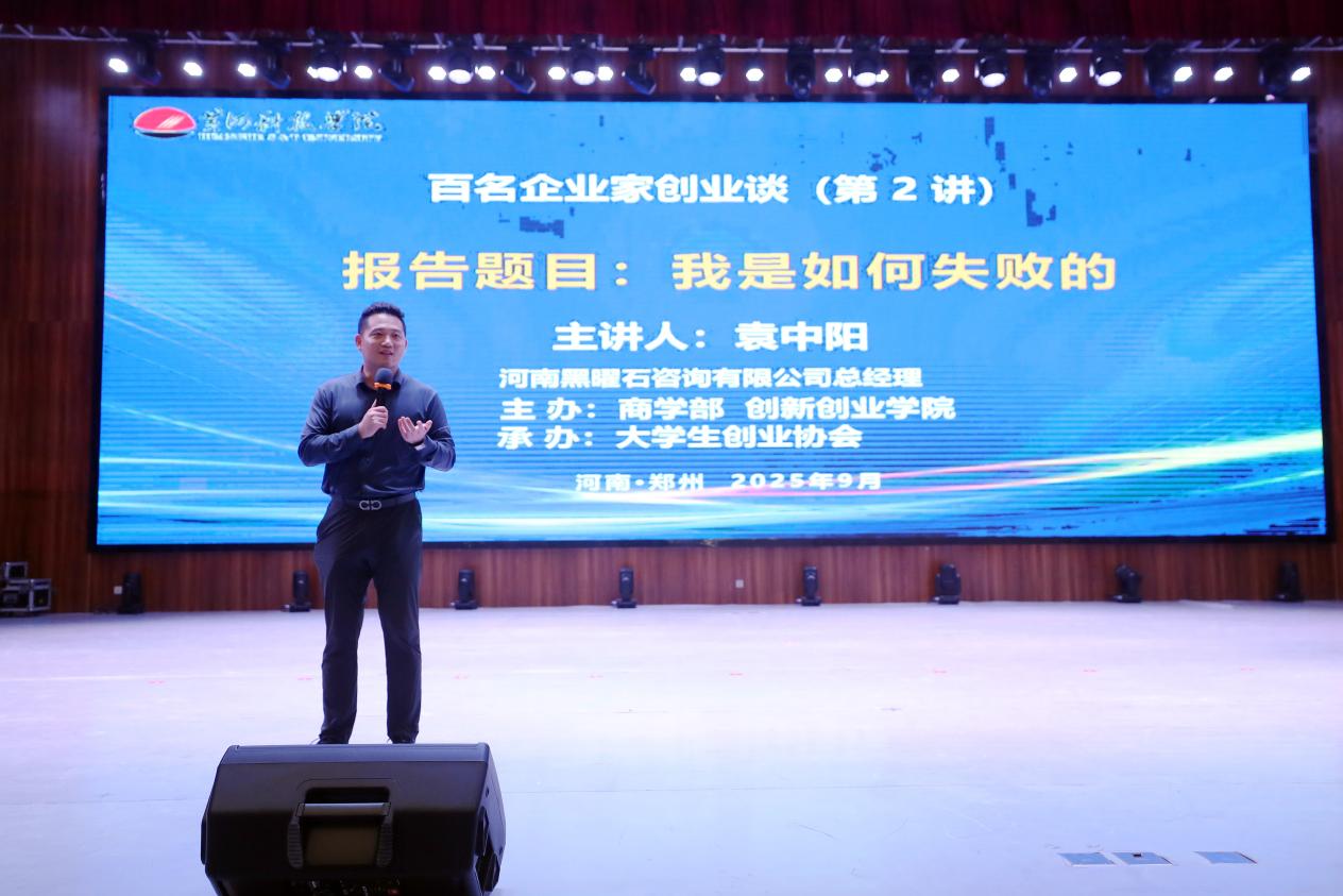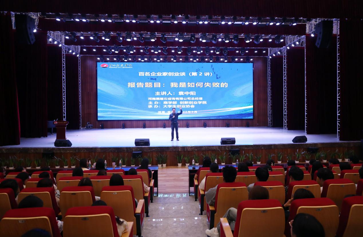 2025年9月12日下午,古天乐太阳集团城《百名企业家创业谈》第2讲在学校艺术中心隆重举行。优秀校友、河南黑曜石咨询有限公司总经理、香港上市公司现任 CEO 兼常务副总经理袁中阳担任主讲嘉宾,讲述了《我是如何失败的》的创业故事。古天乐太阳集团城党委书记郑月、党委副书记、副部长王晓梅出席,400余名2025级学生参加。会议由创新创业科教中心主任岳佳坤主持。