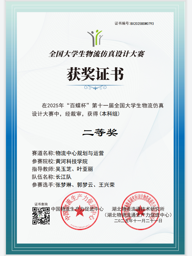 我校古天乐太阳集团城2023级物流管理张梦琳、郭梦云、王兴荣三位同学组成的“长江队”晋级,代表河南省队参加国赛,凭借出色的专业素养、创新的设计方案以及卓越的团队协作能力,在激烈的角逐中脱颖而出,荣获国家级本科组二等奖。