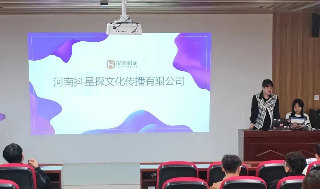 会议开始,河南抖星探文化传播有限公司的人事经理向同学们介绍公司基本情况,公司开放和谐的企业文化,针对应届毕业生提供电商客服等就业岗位等,并鼓励同学们实习以及毕业后到公司就业。会议最后,同学们提出了一些关于薪资,加班以及员工发展等问题,公司人事也就同学们提出的问题进行了解答。