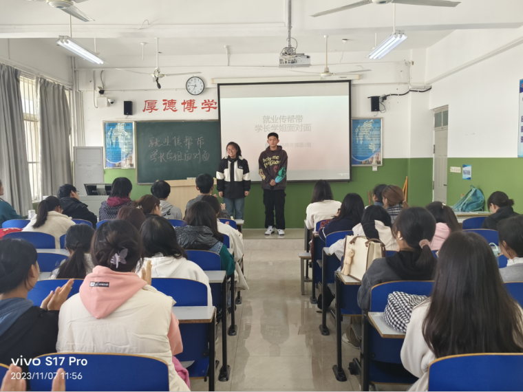 11月8日,22级普本经济学一班开展了此次活动。在本次活动中,学长学姐深入班级,讲解了什么是“就业传帮带”,并把他们自己的求职经历和工作经验通过PPT和大家分享,为同学们提供了许多实用的就业指导。