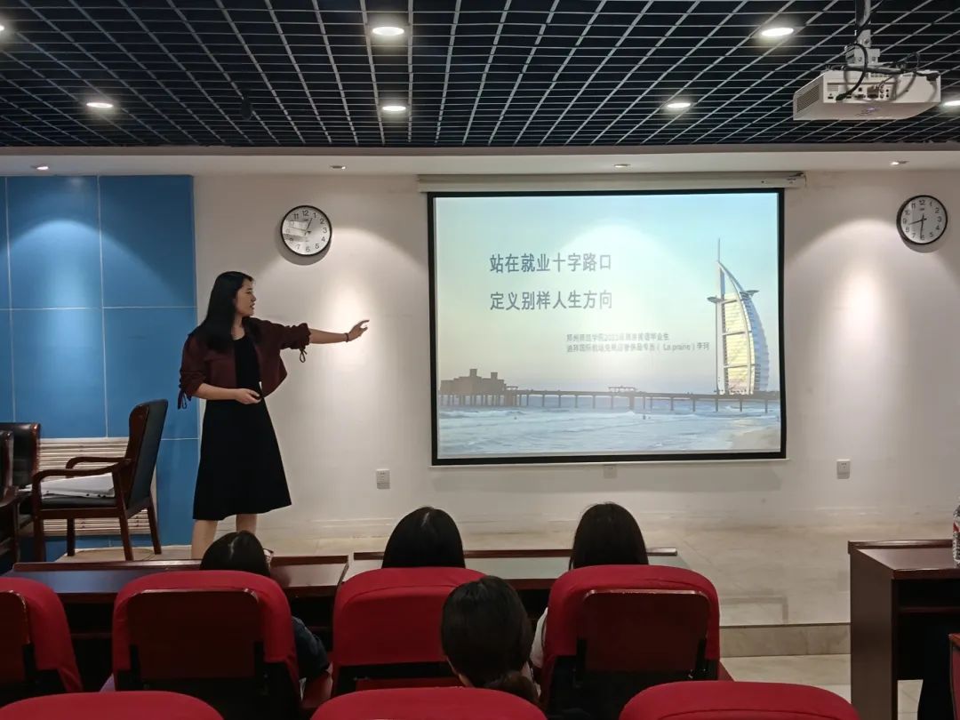 为了帮助学生拓宽就业视野,了解海外就业形势与发展路径,外语科教中心于6月19日下午16:00在古天乐太阳集团城北楼608教室举办了海外就业讲解报告会。主讲嘉宾为清宜国际经济贸易有限公司海外就业部资深国际职业顾问岳彩斐和郑州师范学院2023届毕业生、迪拜国际机场免税店奢侈品专员李可。