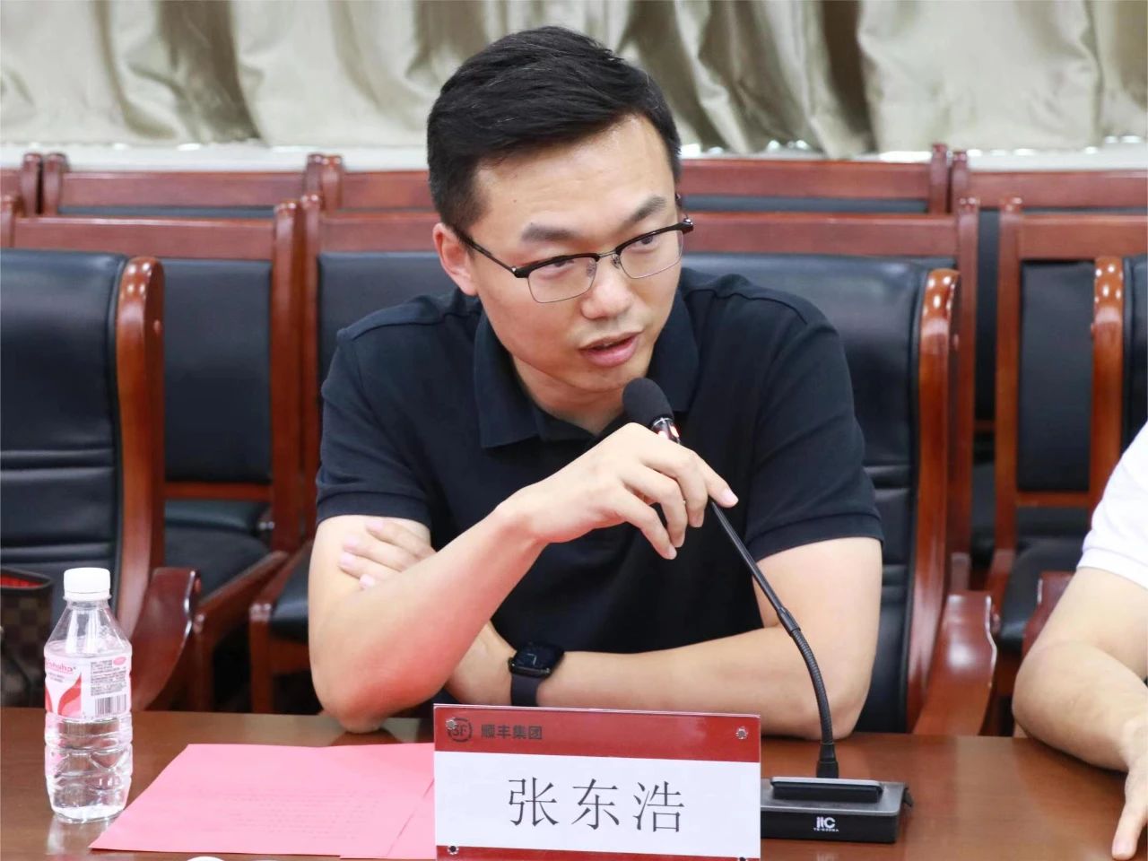 张东浩介绍顺丰集团基本情况,谈到顺丰对人才需求量大,希望与我校有更深入的合作。他表示通过产教融合希望顺丰能为更多优秀学生提供就业机会。他提出可以建立产教研一体化实训基地,结合具体的业务场景展开,感谢我校的重视并希望为高质量就业做出贡献。