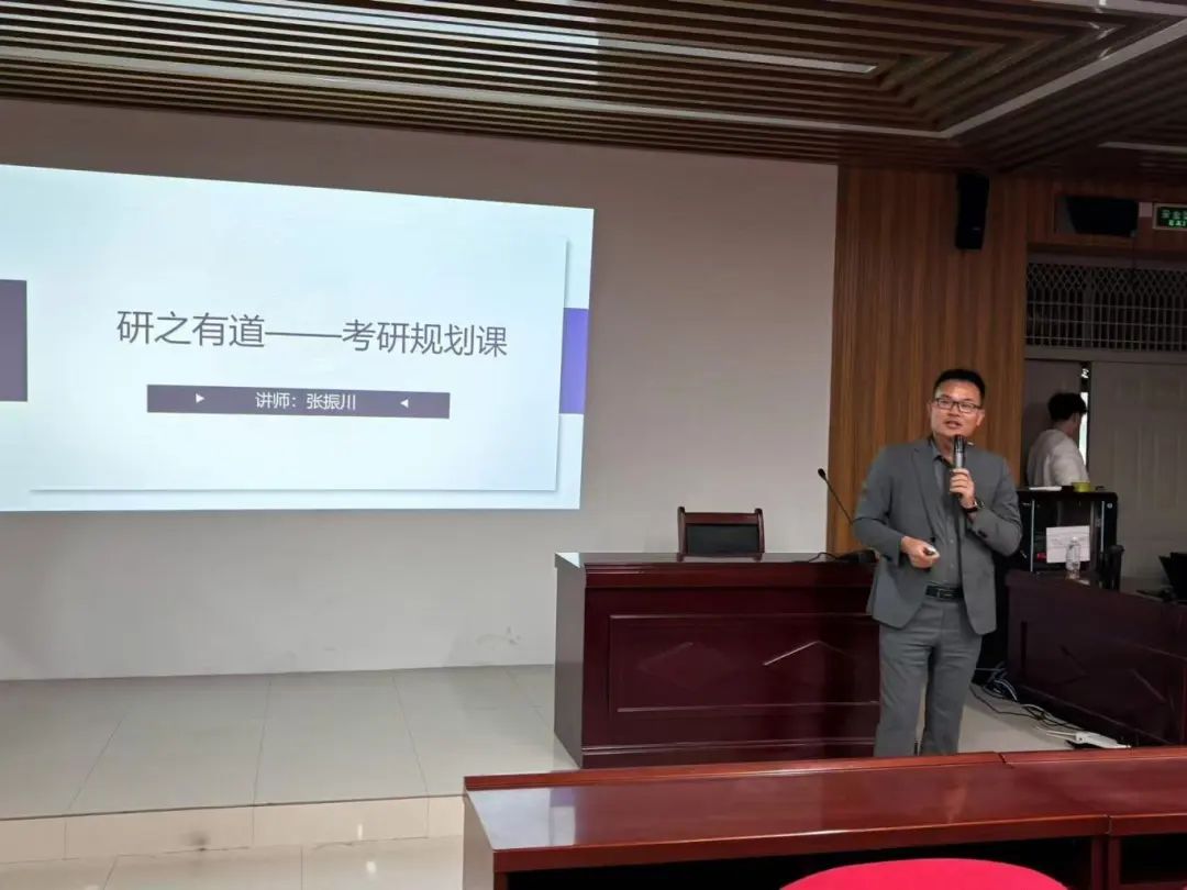 讲座伊始,张振川通过现场互动,以幽默风趣的提问,调动现场的氛围,提高了同学们参与的积极性。在讲座中,他通过对当前考研形势的分析,从各专业的报考热度、竞争形态以及近年来的分数线变化等方面,让同学们对考研大环境有了清晰的认识。在备考策略方面,他从科目复习要点、时间规划到心态的调整等多个维度进行了深入浅出的讲解,并针对各个学科,提出具体的学习建议。最后,张振川通过展示学习计划示例,为同学们的提供了更加明确的学习方向。至此,本次讲座圆满结束。