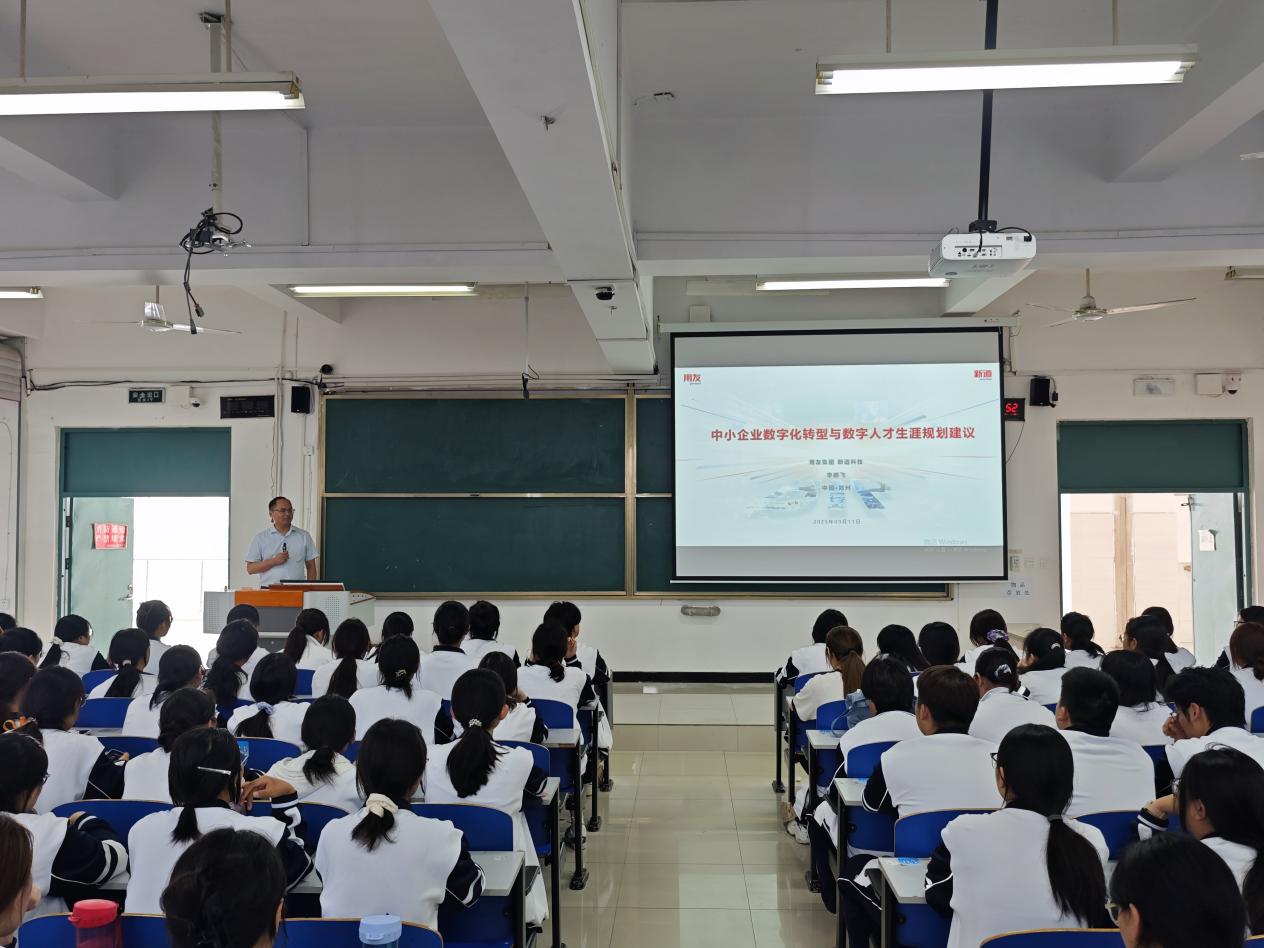 为帮助新生更好地了解行业发展趋势,明确个人生涯规划方向,9月12日,金融与会计科教中心于408教室举办“中小企业数字化转型与数字人才生涯规划”专题讲座。新道科技河南分公司助理总经理李鹏飞担任主讲嘉宾,金融与会计科教中心100余名2025级新生参加。
