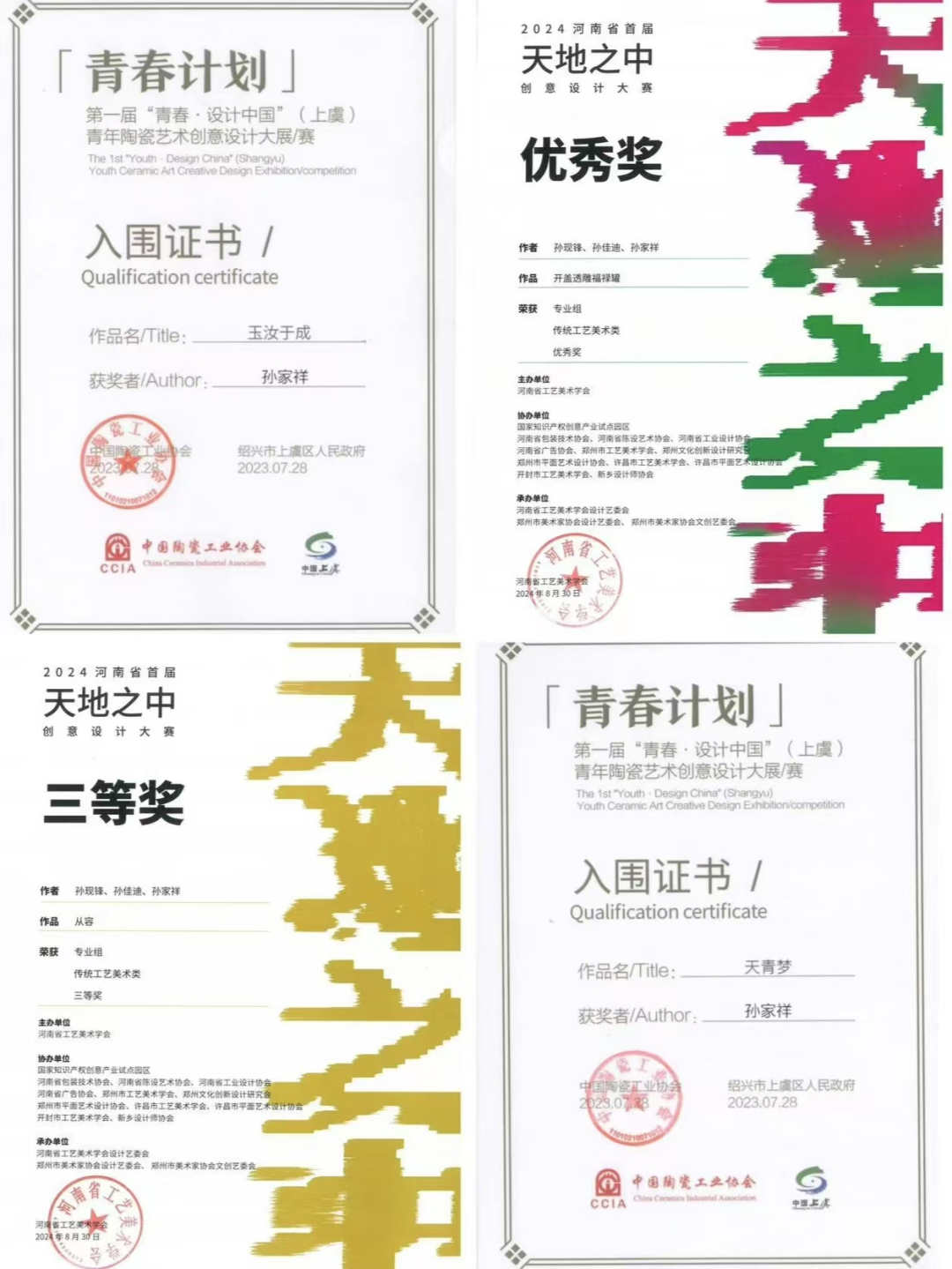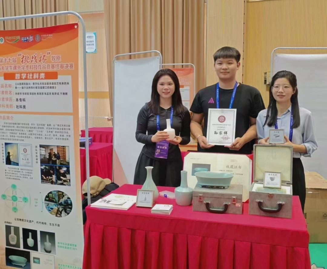 学校非常重视创新创业教育,孙家祥深谙“守正创新”之道,在指导老师精心指导下,2023年他参加创新创业训练计划项目“泥火传奇——让汝瓷文化燃起来”获国家级大学生创新创业训练计划立项,以现代设计语言重构古典美学;同年,孙家祥的作品《天青梦》《玉汝于成》在“青春·设计中国”(上虞)青年陶瓷艺术创意设计大展赛中双双入围,展现跨界融合的巧思。2024年,他在河南省创意设计大赛中凭借《从容》《开盖透雕福禄罐》连摘奖项,将汝瓷的含蓄温润与当代审美无缝衔接。