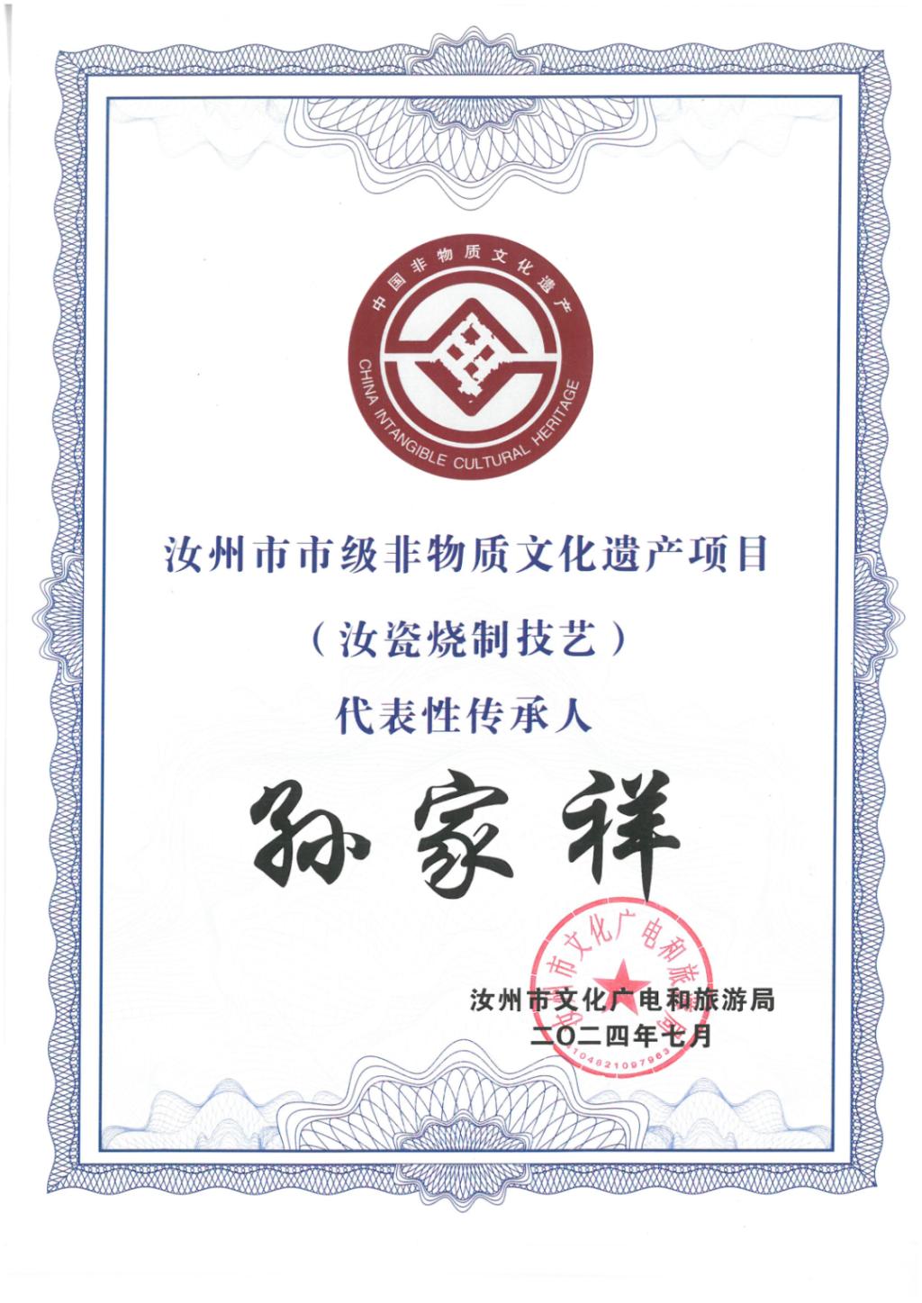 2024,大二的孙家祥被汝州市文化广电和旅游局正式认定为非物质文化遗产代表性传承人。“传承人”三个字,对他而言沉甸甸,充满了激动与随之而来的压力。他清晰地意识到,这份责任早已超越了家族的界限,成为了关乎家乡汝瓷文化乃至整个中华传统工艺传承的宏大事业。那一刻,他深知自己不再是单纯的学徒,手捧的已然是守护千年窑火、接续文化根脉的神圣使命。