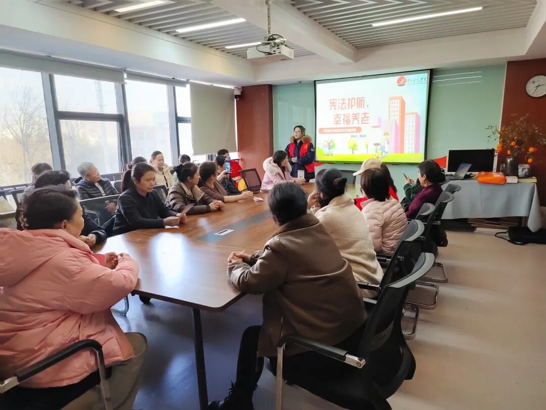 活动伊始,宣讲团成员为在场社区居民发放国家宪法日宣传册,宣讲人易徐可以PPT的形式分别从宪法基础知识、宪法保障的老年人核心权益、常见风险与维权方式等方面展开讲解。在宪法基础知识方面,向在场社区居民讲解宪法的定义和意义,活动过程中,易徐可与社区居民充分互动,提问大家是否知道宪法赋予了老年人哪些重要的权益,社区居民纷纷抢答。接着,法治宣讲团成员通过演绎保健食品诈骗和扫描二维码领取奖品等情景剧来展现生活中常见的诈骗行径,并普及防诈骗和维权途径,吸引在场社区居民认真观看学习,并获得阵阵掌声。最后,法治宣讲团成员组织大家开展投壶趣味游戏,并为聆听本次宣讲的社区居民分发宪法钥匙扣、中华人民共和国宪法、小红旗等纪念品。