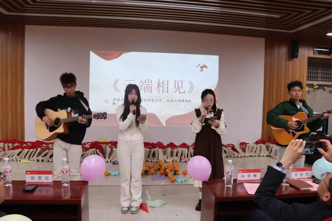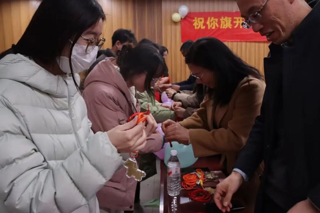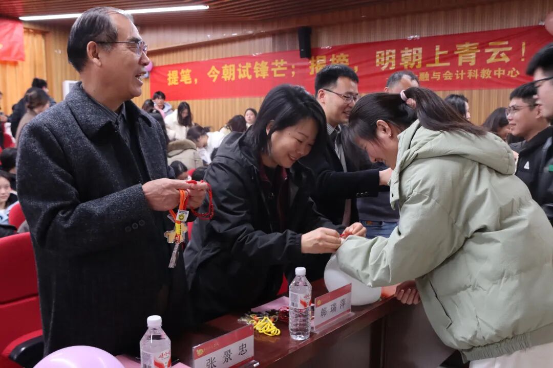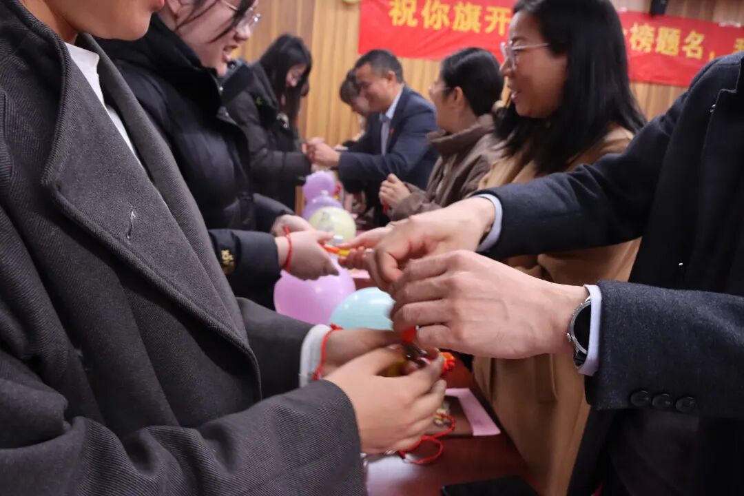 互动环节成为大会的暖心亮点。领导与老师们亲手为学子们系上红色“上岸绳”,赠送寓意“马到成功”的上岸金马,红绳系腕、金马在手,不仅是“鸿运加持”的美好祝愿,更让学子们感受到沉甸甸的期望,进一步强化了冲刺必胜的信念。随后,惊喜闪现的励志歌曲《云端相见》瞬间点燃现场氛围,悠扬的旋律与励志的歌词传递出“顶峰相见”的约定,让学子们在歌声中汲取奋进力量。
