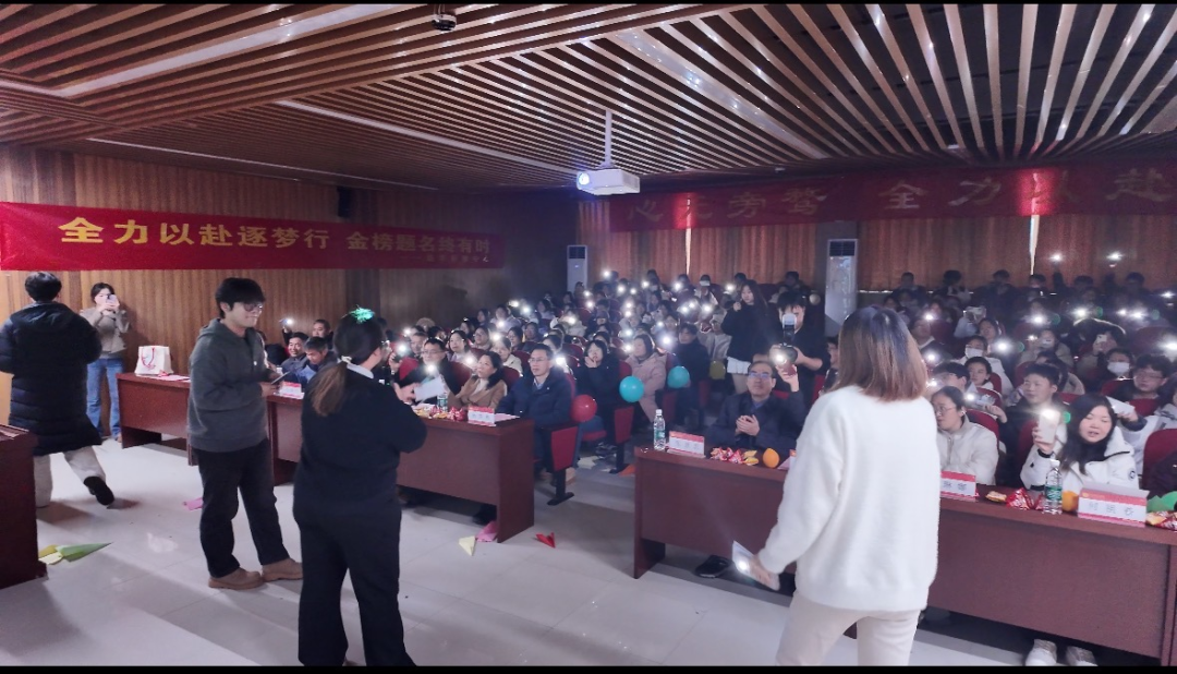 考研导师代表孙广坤老师携满满“备考干货”登台分享,从专业课重难点梳理、公共课答题技巧,到考前时间规划、考场应变策略,逐一拆解考研冲刺关键要点。随后,学弟学妹倾情献唱励志歌曲《追梦赤子心》,“不妥协直到变老”的激昂歌词响彻会场,唱出对学长学姐逐梦之路的支持与祝福,不少同学热泪盈眶,更坚定了“一战成硕”的信念。