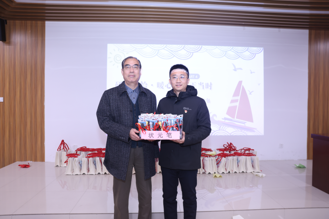暖心护航,补给先行。大会现场,领导与教师为每位考研学子送上寓意“妙笔生花、金榜题名”的状元笔,以及装满备考物资的考研加油包。接过沉甸甸的礼物,学子们脸上洋溢着感动与坚定,这份关怀不仅是物质支持,更是精神鼓舞,让大家在冲刺路上底气更足、信心更满。
