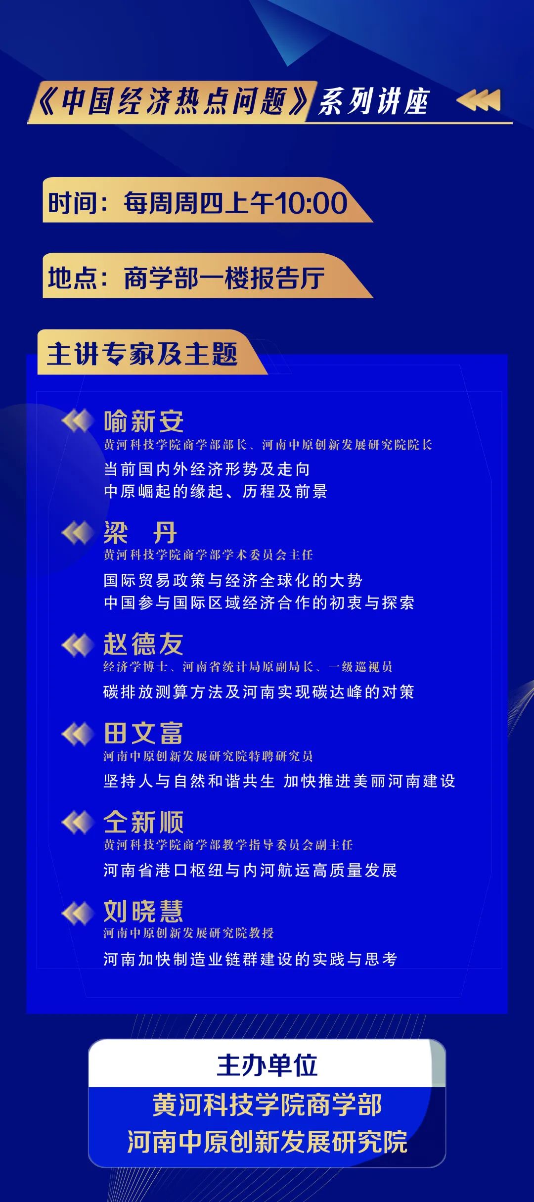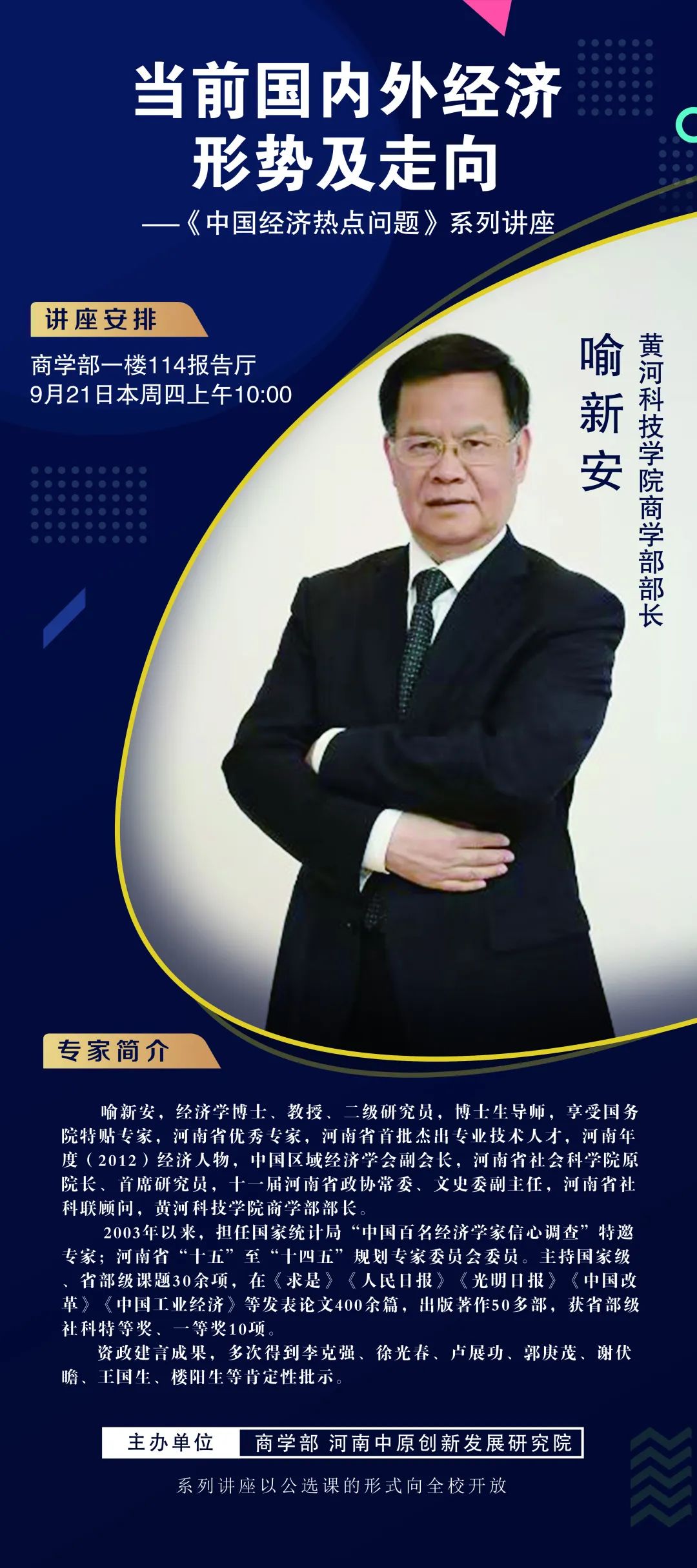 新学期伊始,为引导学生关注大局,活跃学术氛围,古天乐太阳集团城古天乐太阳集团城、河南中原创新发展研究院开设了《中国经济热点问题》系列讲座。系列讲座拟安排六位专家,以公选课的形式向全校学生开放,共设八讲。