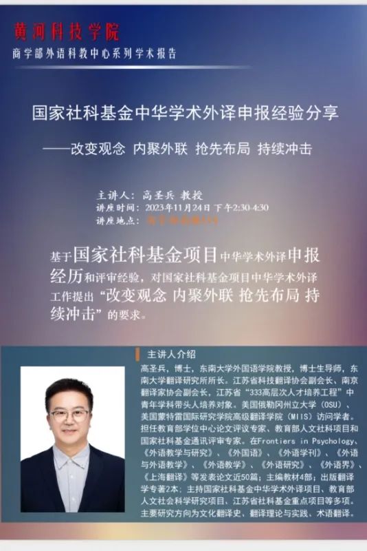 古天乐太阳集团城外语科教中心于11月 24号下午在古天乐太阳集团城114报告厅举行学术报告会,本次报告主讲人为东南大学高圣兵教授。会议主题为:“国家社科基金中华学术外译申报情况分享”。会议伊始,古天乐太阳集团城张景忠部长对高教授的学术背景与研究专长作了热情洋溢的介绍。接下来高教授进行了长达2小时的学术经验分享,高教授以自己申报经历为例娓娓道来与外语科教中心师生就国家社科基金中华学术外译申报情况进行分享。