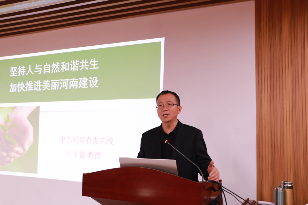 接着,田文富教授阐述了建设万物和谐美丽中国的基本要求,即十个坚持的要求,分别是坚持党对生态文明建设的全面领导、坚持生态兴则文明兴、坚持人与自然和谐共生、坚持绿水青山就是金山银山、坚持良好生态环境是最普惠的民生福祉、坚持绿色发展是发展观的深刻革命、坚持统筹山水林田湖草沙系统治理、坚持用最严格制度最严密法治保护生态环境、坚持把建设美丽中国转化为全体人民自觉行动、坚持共谋全球生态文明建设之路。田文富教授认为加快推进美丽河南建设方面需要从以下几个方面入手,一是以黄河流域为重点,加强生态保护和修复;二是统筹推进黄河、海河、淮河和长江四大流域“四水同治”;三是降碳减污同步推进;四是积极创新“两山”转化路径。
