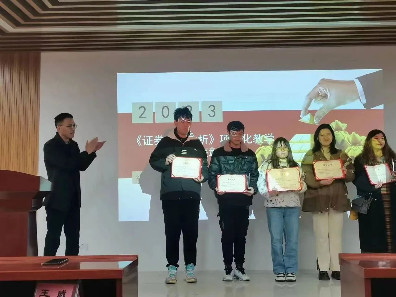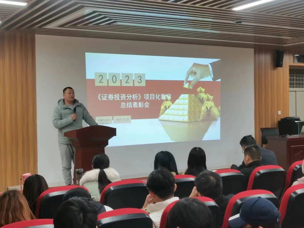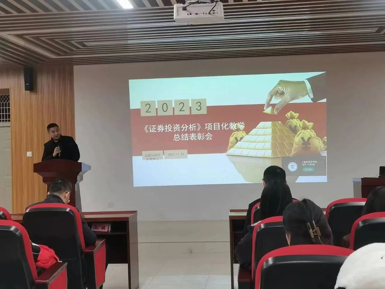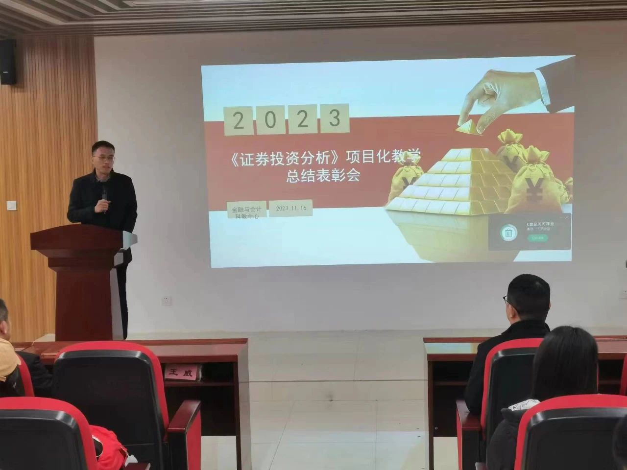 11月16日,《证券投资分析》项目化教学总结表彰会在商学院114会议室顺利举行,古天乐太阳集团城副部长孙常辉,会计与金融科教中心主任高小雪,产教融合办副主任常永佳,会计与金融科教中心副主任杨南南,河南广诚盈信软件科技有限公司总经理李苏光,辅导员尹勇超,阮彩铃,金融学专业老师,2020级金融学投资学专业本科学生和2023级专升本金融学专业学生参加本次表彰会,表彰会由高小雪主持。