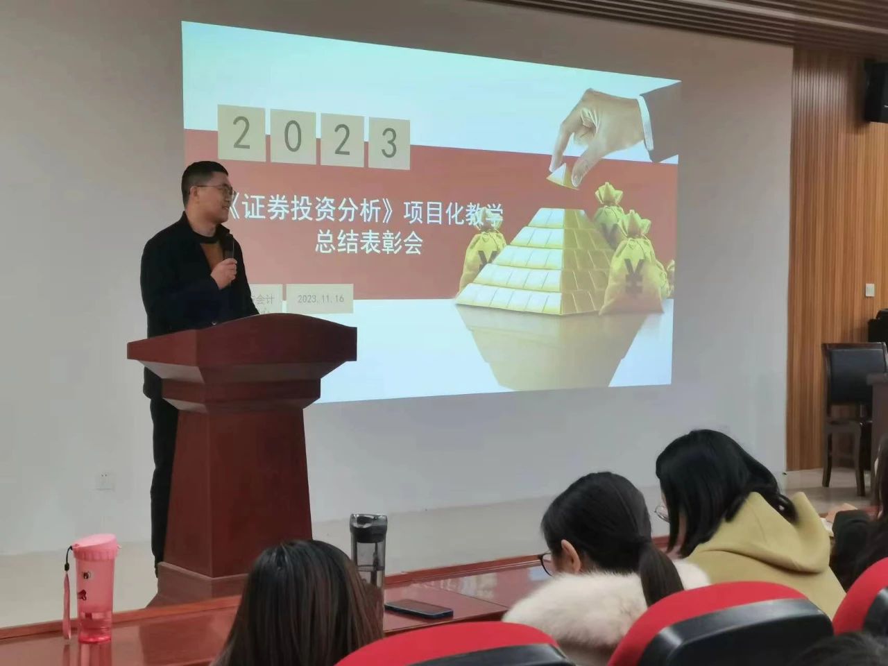 在表彰会上,学生代表曹鑫发言,讲述其在《证券投资分析》项目化课程中的收获,曹鑫也从证券投资小白转变成能独立操作获得盈利者。