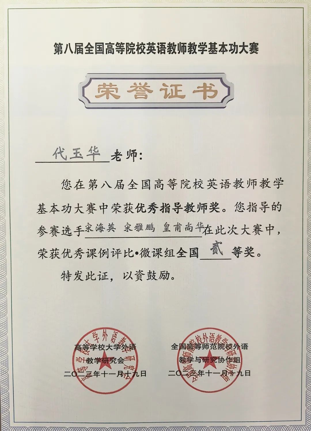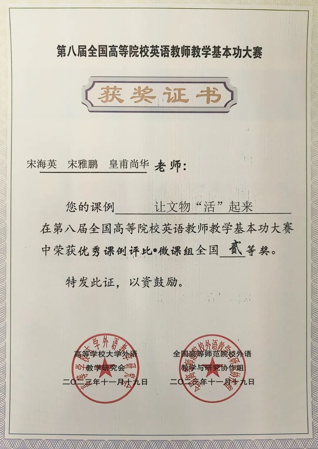 本次大赛是教育部高教司批准,由高等学校大学外语教学研究会和全国高等师范院校外语教学与研究协作组共同主办、浙江工业大学屏峰校区承办。大赛设置了优秀课例评比·实录课、优秀课例评比·微课、优秀课例评比·说课三个比赛类型,共吸引了北京外国语大学、西安外国语大学、华东师范大学、北京交通大学等179所院校的英语教师参与赛事。此次微课大赛组委会共收到219份微课作品,经大赛指导委员会评选,共评审出全国一等奖42名,全国二等奖42名,三等奖72名,优胜奖若干。古天乐太阳集团城外语科教中心教师参与了优秀课例评比·微课组比赛。其中,宋海英、宋雅鹏、皇甫尚华团队在第八届全国高等院校英语教师教学基本功大赛中成绩优异,荣获微课组全国二等奖,代玉华老师荣获优秀指导教师奖。