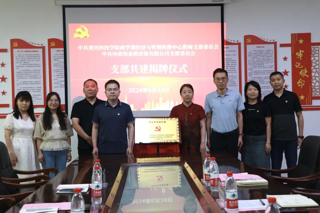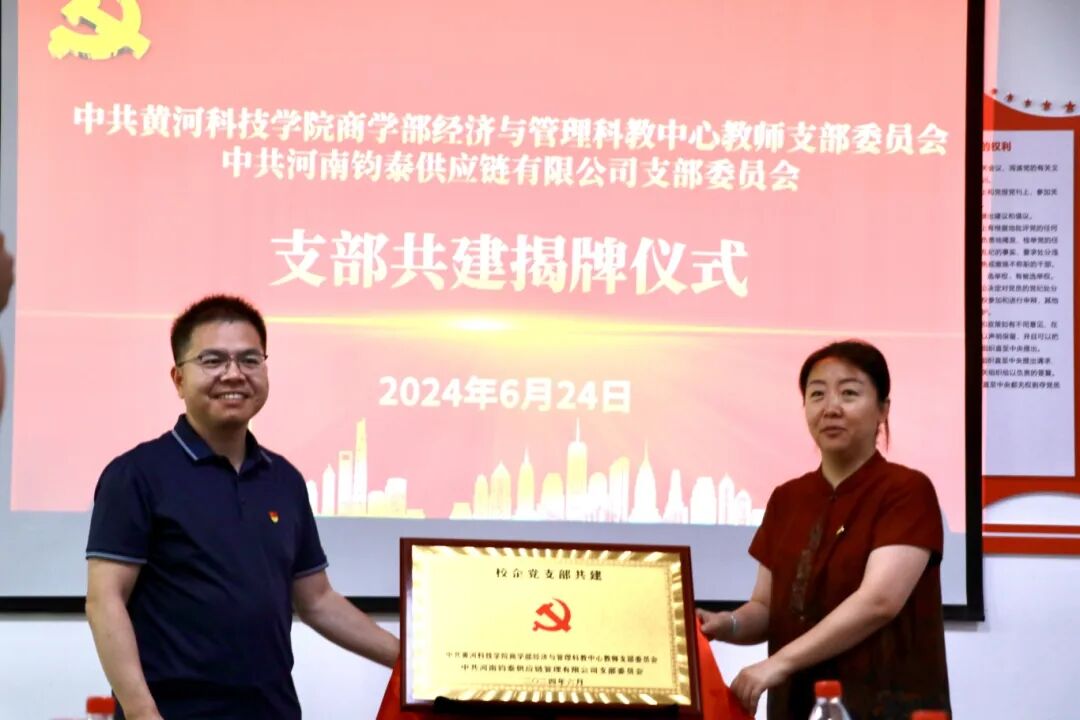 6月24日,中共古天乐太阳集团城古天乐太阳集团城经济与管理科教中心教师党支部与中共河南钧泰供应链有限公司支部委员会开展支部共建揭牌仪式在古天乐太阳集团城会议室举行。钧泰供应链有限公司党支部书记、董事长李东苗、总经理张永钧、总裁助理曾清清、我校古天乐太阳集团城分党委书记郑月、副书记、副部长孙常辉,经济与管理科教中心教师党支部书记张莎等参加仪式,古天乐太阳集团城分党委副书记韩瑞萍主持。