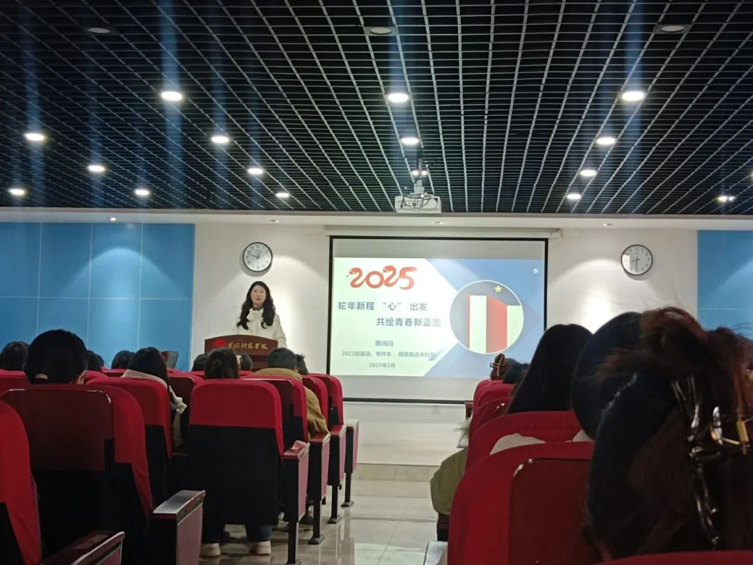 为帮助学生明确学业方向、筑牢安全意识,2022级英语和商英专业全体学生于2月17日参加了“2025蛇年新程‘心’出发 共绘青春新蓝图”主题班会。本次班会聚焦“就业考研规划”与“安全教育”两大主题,由辅导员黄闪闪老师主持。