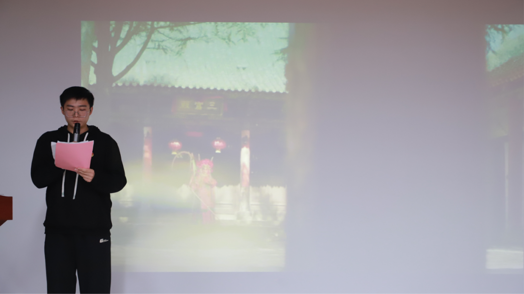 六号选手张宇博同学以他一首原创的豫剧主题小诗为引,用他那富有磁性且沉重浑厚的声音,向同学们展现了豫剧艺术的魅力。豫剧那独特的韵律节奏、华丽绚烂的表演和丰富多彩的故事情节,赢得广大民众的喜爱。伴随着他的朗诵,同学们仿佛听到了那激昂的唱腔在耳边回荡,每一个音符中展现了中华文化的博大精深。