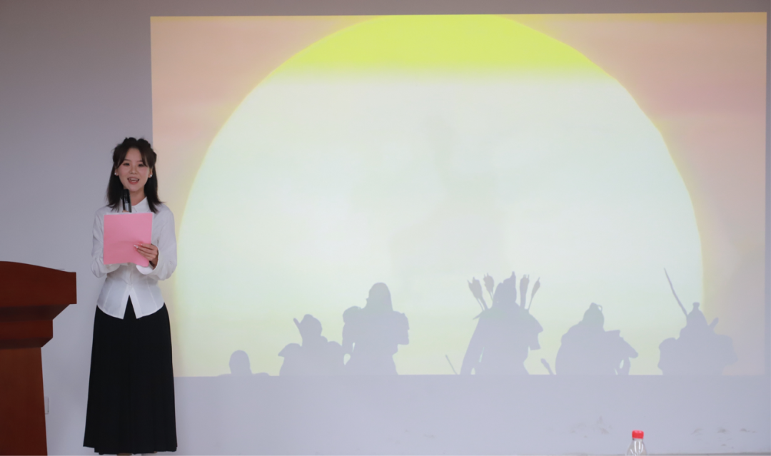 五号选手王小庆和李好同学携手为同学们呈现了一场如美如幻的皮影戏之旅。她们以魏力群的《皮影》为素材,采用交替朗诵的方式,用轻柔如丝、富有感情的音色,将皮影戏的历史沿革缓缓道来,仿佛置身于光影交错的皮影戏表演之中,那东方的韵味与诗意如涓涓细流般淌入同学们的心间。
