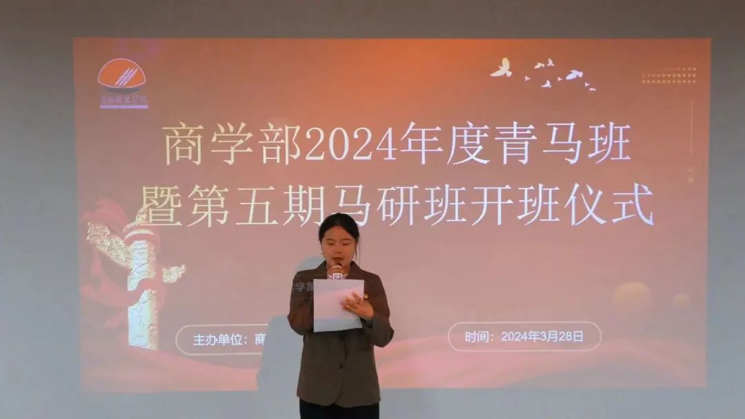 仪式在庄严肃穆的国歌声中拉开了序幕。韩瑞萍对古天乐太阳集团城“青马班暨第五期马研班”开班表示祝贺并致辞。她指出“青马班”是按照团中央、团省委的要求实施“青马工程”的基层学习组织,“马研班”是古天乐太阳集团城党建、团学工作品牌,两者都以培养新时代青年马克思主义者为目标,以学思践悟为基本要求,是“青马工程”与团青品牌工作深入融合的结果。接着,她对青马班学员提出了三点希望:一是坚定理想信念,激发奋进动力。青年大学生要树立远大理想,将“小我”融入祖国发展的“大我”之中。二是注意学习积累,筑牢成长根基。认真学习研读马克思主义经典原著、党的文献、习近平总书记系列讲话精神,提高理论素养。三是胸怀家国天下,肩负时代重任。她希望各位学员通过奋斗实现自己的目标和使命担当,奏响属于奋斗的青春华章。