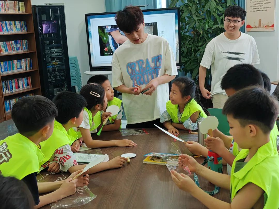 活动伊始,由伊木然介绍中国悠久的文化历史和深厚的文化底蕴来引出本次活动的主题。伊木然向小朋友们介绍了漆扇的由来以及制作他们所需要的材料和过程,并播放制作漆扇的相关视频,加深小朋友们对漆扇的认知,呼吁小朋友们对非遗文化进行保护和传承。随后,谢杨曦、白一丹等同学带领小朋友们开展翻花绳的小游戏,小朋友们都积极踊跃地参与其中,并依次向周围的伙伴传递。在张玉杰,白一丹,伊木然的带领下,小朋友们开展了趣味投壶的游戏,小朋友们都非常认真的投入其中,一次次的失败中并没有气馁体现出了坚持不懈的精神。最后,进入到制作漆扇的环节,由荆泽恩向小朋友们详细介绍制作的方法及流程,并给小朋友们发放材料包。荆泽恩,刘宸君等同学引导辅助小朋友制作漆扇,小朋友们根据自己的喜好,发挥想象力,亲手制作出了属于自己独一无二的漆扇。活动结束,小朋友们合影留念,记录下了这美好的一刻。