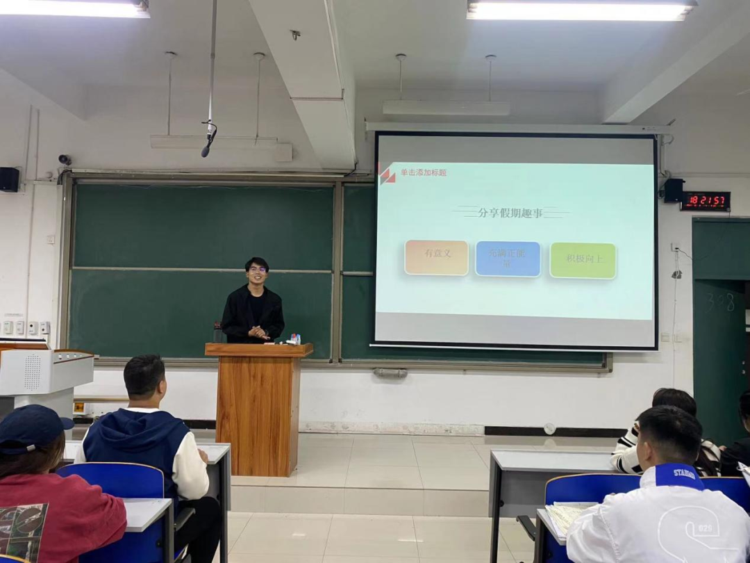 接着,她引导同学们对国庆假期期间自己看到的“向上的力量”进行了分享。同学们积极发言,现场气氛热烈。张子恒同学谈到,国庆假期期间遇到了一队骑行的夕阳红团队,看到他们努力向上的样子自己很受感动。最后,张琳娜强调每一名同学都应该保有对生活的热爱,积极融入丰富多彩的校园生活中,科学规划好个人的学习,用个人的持续努力为自己的大学生活添彩。