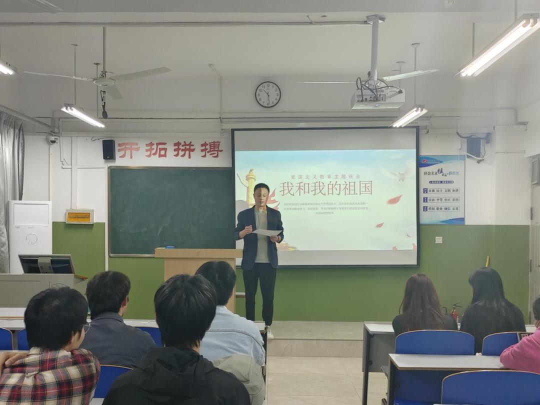 班会伊始,张倩从中华民族生生不息的重要精神基因、爱国主义在任何情况下都不能弱化,更不能丢掉、在新时代的历史方位中更好地弘扬爱国主义和立足本职岗位以及践行爱国奋斗精神四个方面向同学们诠释了爱国主义核心内容。接着,她和同学们共同回顾了新中国的发展历程。屏幕上一幕幕飞速发展的场景,共同谱写成了振奋人心的祖国颂歌。会议现场气氛热烈,大家在浓厚的爱国情感氛围中,重新认识了祖国站起来、富起来再到强起来的发展轨迹。最后,张倩对同学们作出寄语,爱国不仅仅是一种情感,更是一种责任,在未来的日子里,新时代的大学生要以更加坚定的步伐,扛起使命担当,为祖国的繁荣和发展贡献自己的一份力量!