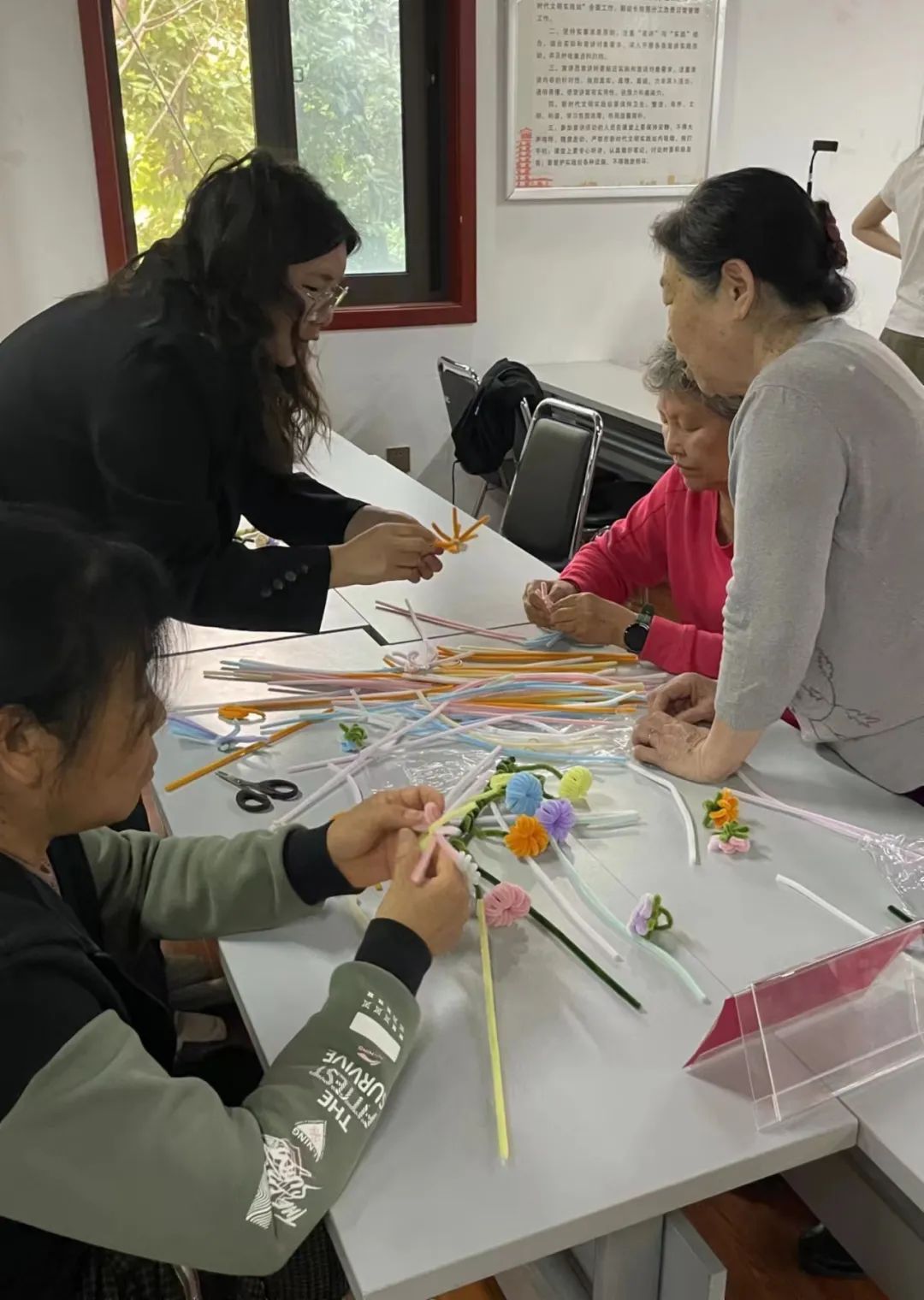 随后,同学们细心地给老人们讲解用扭扭棒折花的步骤和技巧,经过同学们的指导,老人们逐渐掌握了制作要领,他们挑取自己喜欢的颜色,动起手来,弯一弯、折一折、扭一扭,一朵朵可爱的扭扭花在他们手中诞生。活动结束后同学们与参与本次活动的老人们合影留念并对本次活动进行总结与反思。