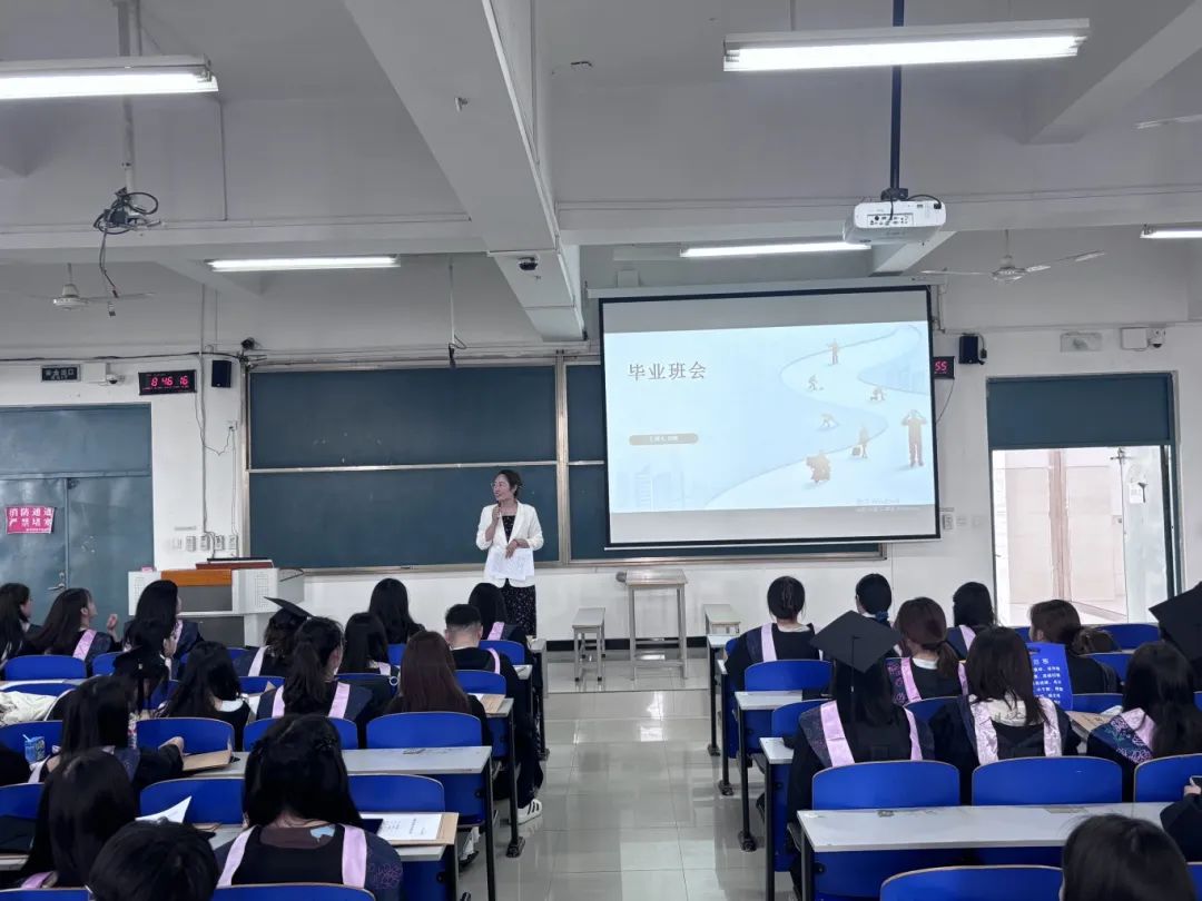 会议尾声,刘琳深情回顾同学们大学四年在学习、实践、成长等各方面的精彩表现,并进行系统总结。她饱含深情地寄语同学们,无论未来选择哪条人生道路,都要秉持初心、善始善终;无论前行途中遭遇何种风雨,都不要忘记母校的培育之恩,常回母校看看,多与老师们交流分享。这些真挚的话语,承载着师长的殷切期望与深深牵挂。