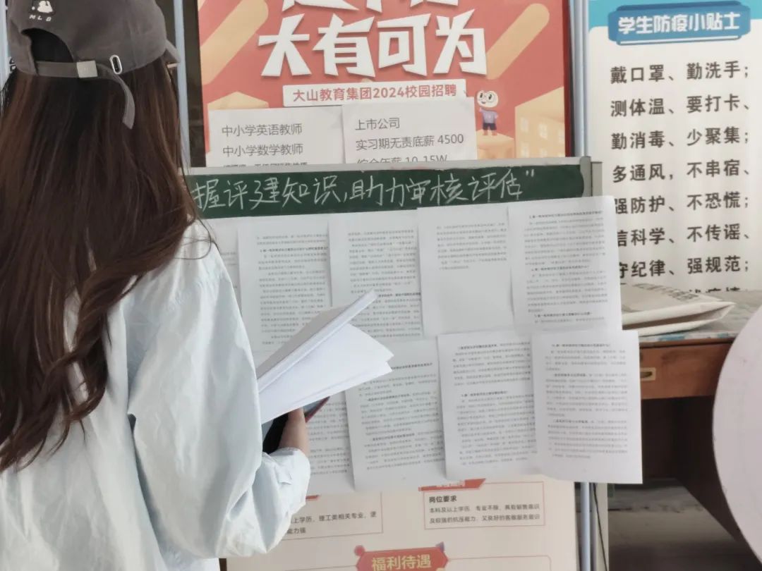 师生们纷纷驻足观看,认真学习审核评估相关知识要点。同时,现场还有相关学生进行讲解,他们对审核评估的基本概念、评估程序等内容进行深入阐释,并设置了互动答疑环节。