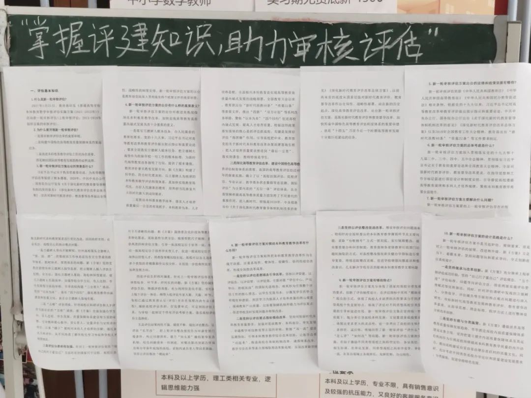 活动现场,资料以海报的形式张贴在黑板上集中展示,内容涵盖本科教育教学审核评估的政策文件解读、指标体系说明等。