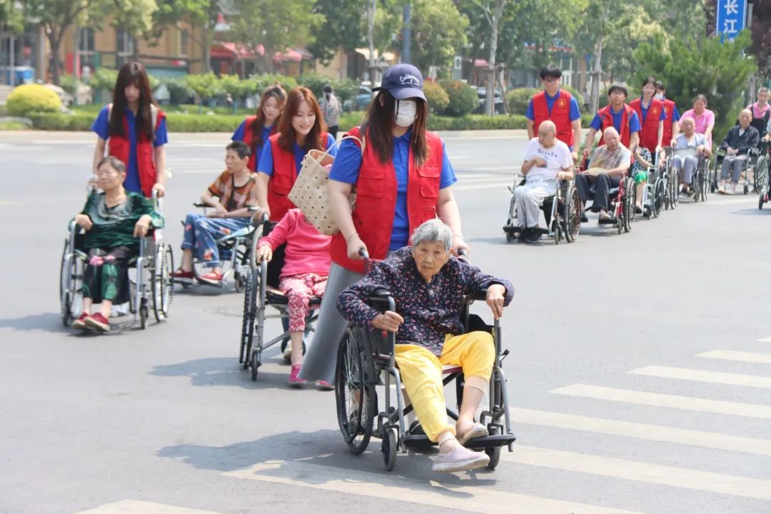 接着,在工作人员的引导下,同学们整齐成队,小心翼翼地推着老人们来到阳光明媚的户外晒太阳。同学们一边轻声细语地与老人交谈,一边仔细观察着老人们的需求,阳光洒在老人们布满皱纹却绽放着笑容的脸上,也洒在同学们青春洋溢的身影上,画面温馨极了!