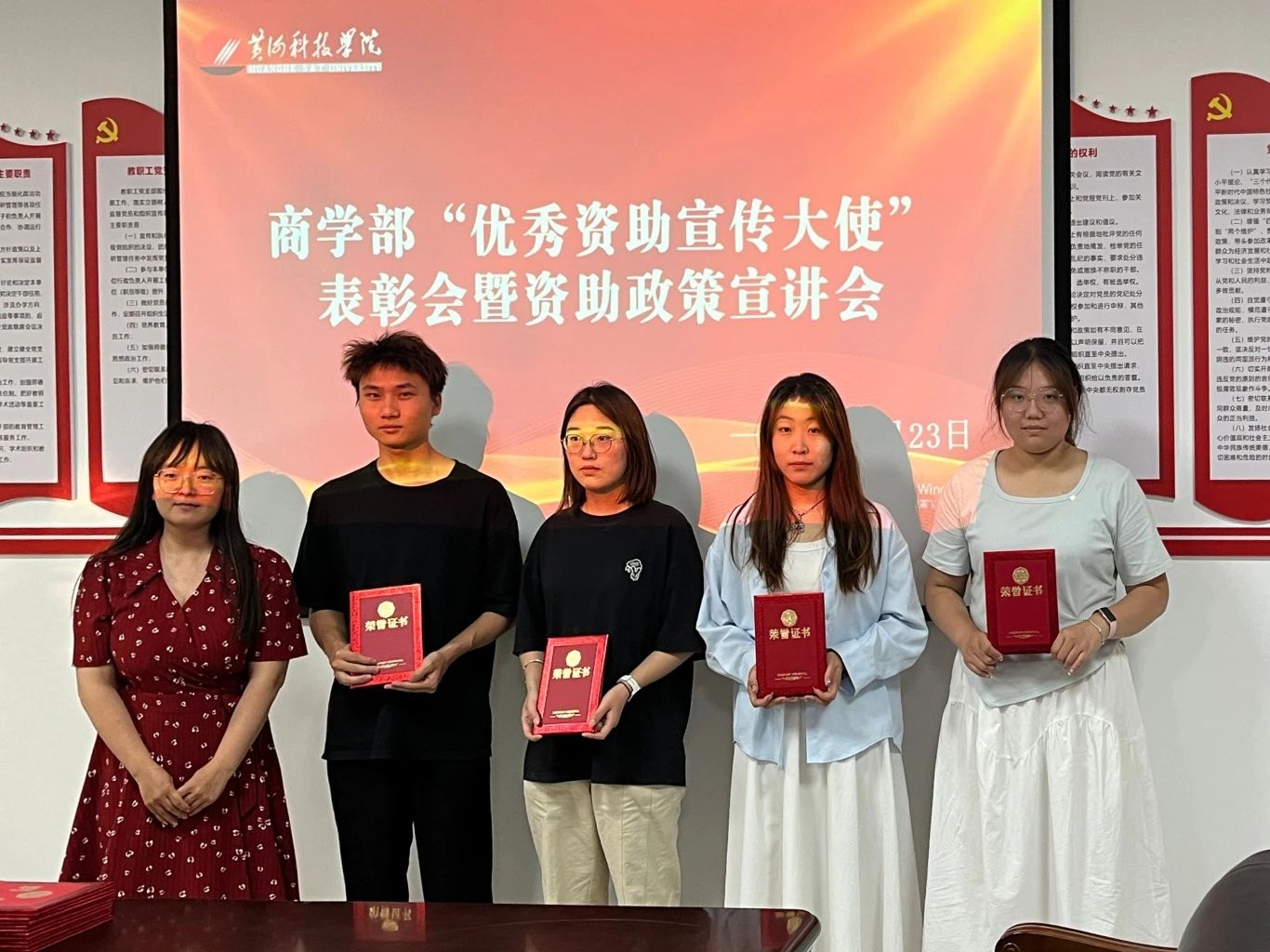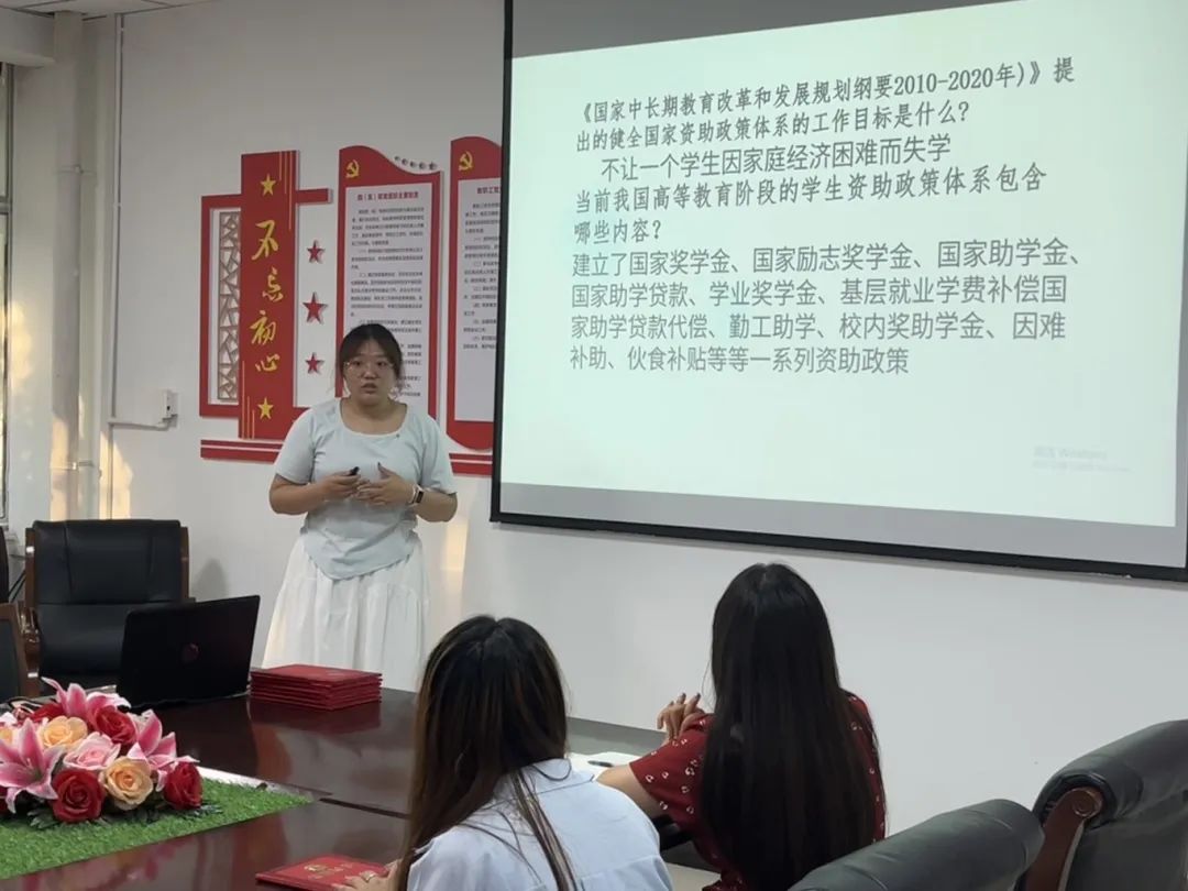 随后,与会老师为表现突出的资助宣传大使颁发荣誉证书,肯定其在政策普及、学生帮扶中的突出贡献。表彰环节不仅是对个人成绩的认可,更以榜样示范激发更多学子投身资助宣传的热情。紧接着,田瑞青老师开启资助政策宣讲培训,围绕国家及学校资助体系,从奖助学金、助学贷款到临时困难补助,系统解读项目类别、申请条件、审核流程及发放细则,以专业化培训提升宣传队伍政策解读能力。