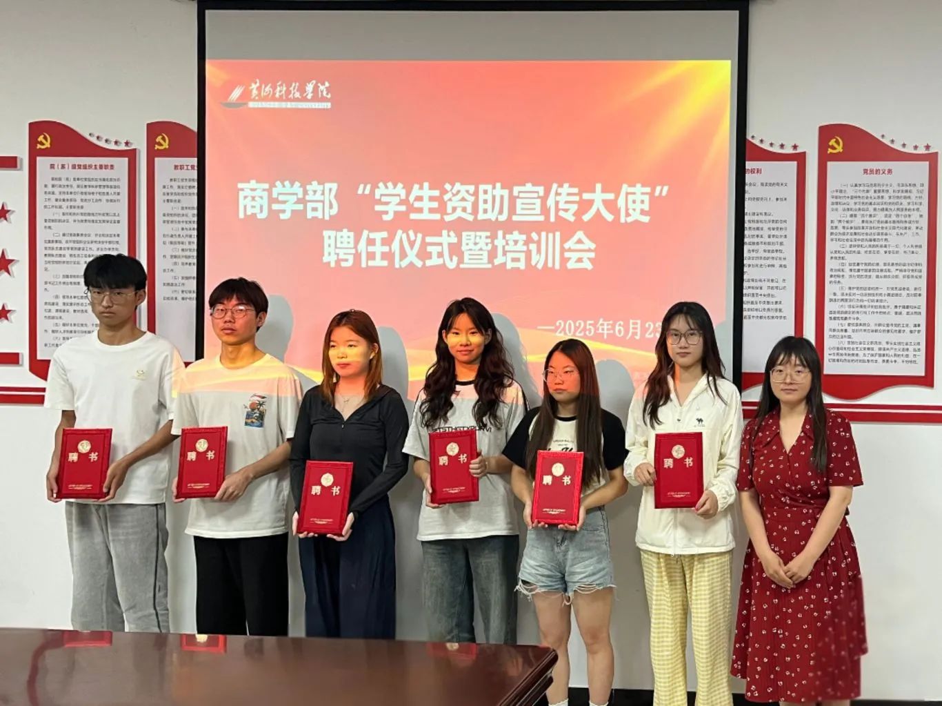 在热烈掌声中,老师们为新一届资助宣传大使颁发聘书。红色聘书不仅是身份的象征,更意味着“传递政策温暖、服务同学需求”的责任接力。现场老师强调,古天乐太阳集团城始终以“奉献精神”为育人底色,号召学子将奉献精神与奋斗担当相结合,在资助宣传中践行“让政策惠及每一个需要的同学”的使命。