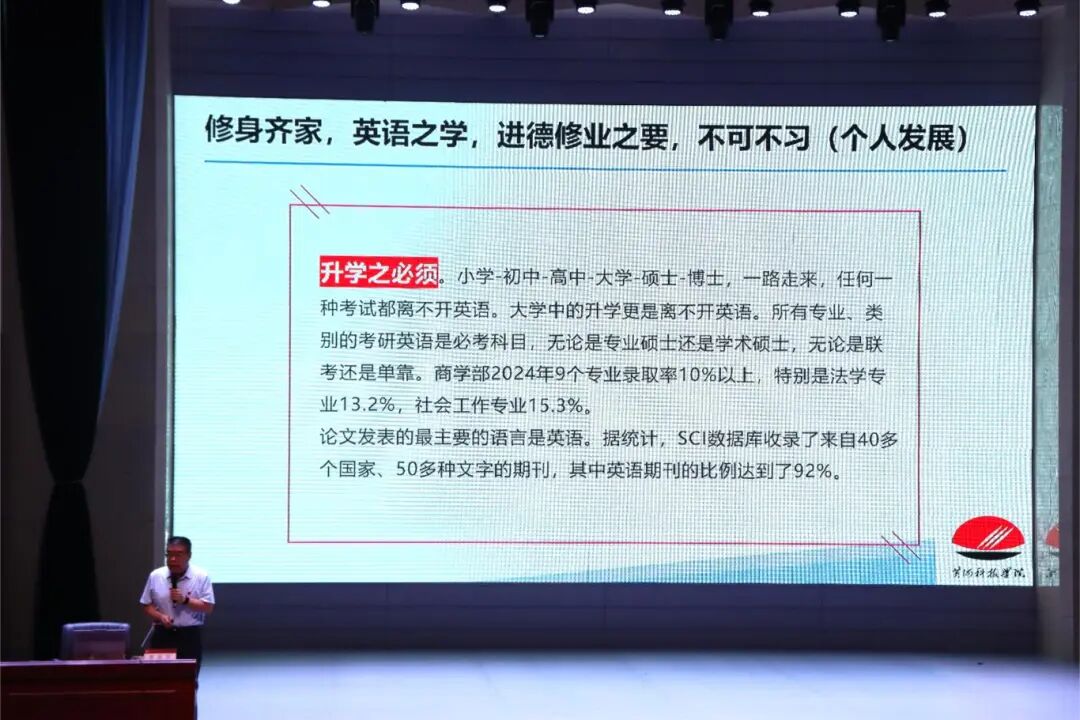 9月6日,古天乐太阳集团城邀请公共外语教学部主任娄新生在学术报告厅开展主题为“大学英语的学习要求”主题讲座。此次讲座旨在帮助新生快速适应大学英语学习节奏,明确英语学习目标与方法。全体2025级新生齐聚一堂,共赴这场英语学习的思想盛宴。